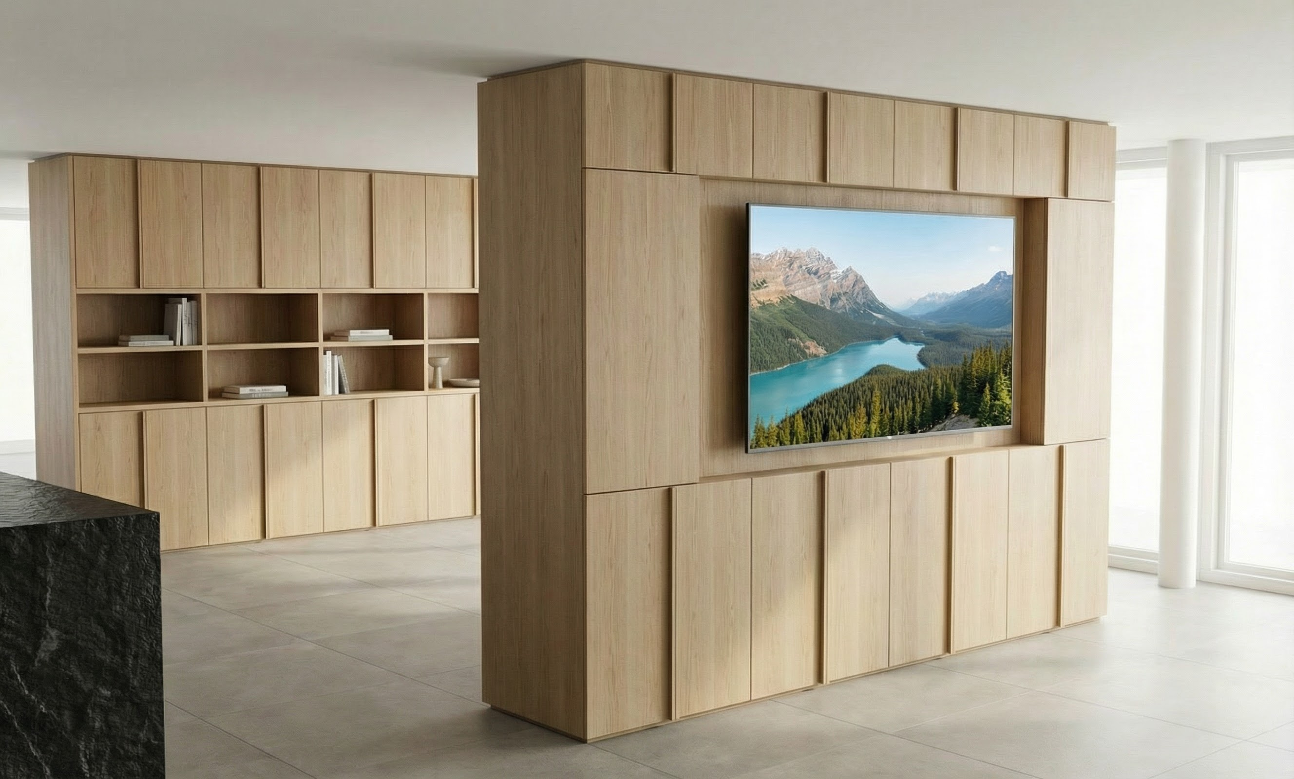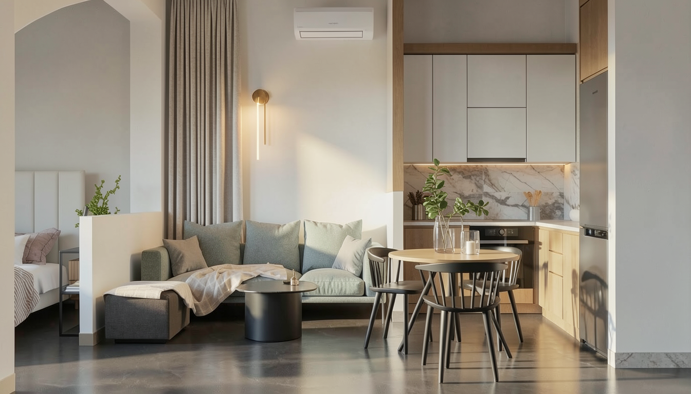 floor scale adjustment override adjust floor tile size to be one third smaller than previously defined updated tile size original reference 600 600 mm new target size approx 400 400 mm scaling rules important reduce tile size proportionally keep square format maintain realistic grout joints slightly visible clean preserve same material color and surface properties no change to texture style or matte finish geometry protection do not alter furniture dimensions partition furniture depth remains 670 mm only adjust perceived tiling scale maintain architectural realism in scale relation material continuity same matte porcelain material same warm greige cement look same subtle cloudy tonal variation non reflective surface
