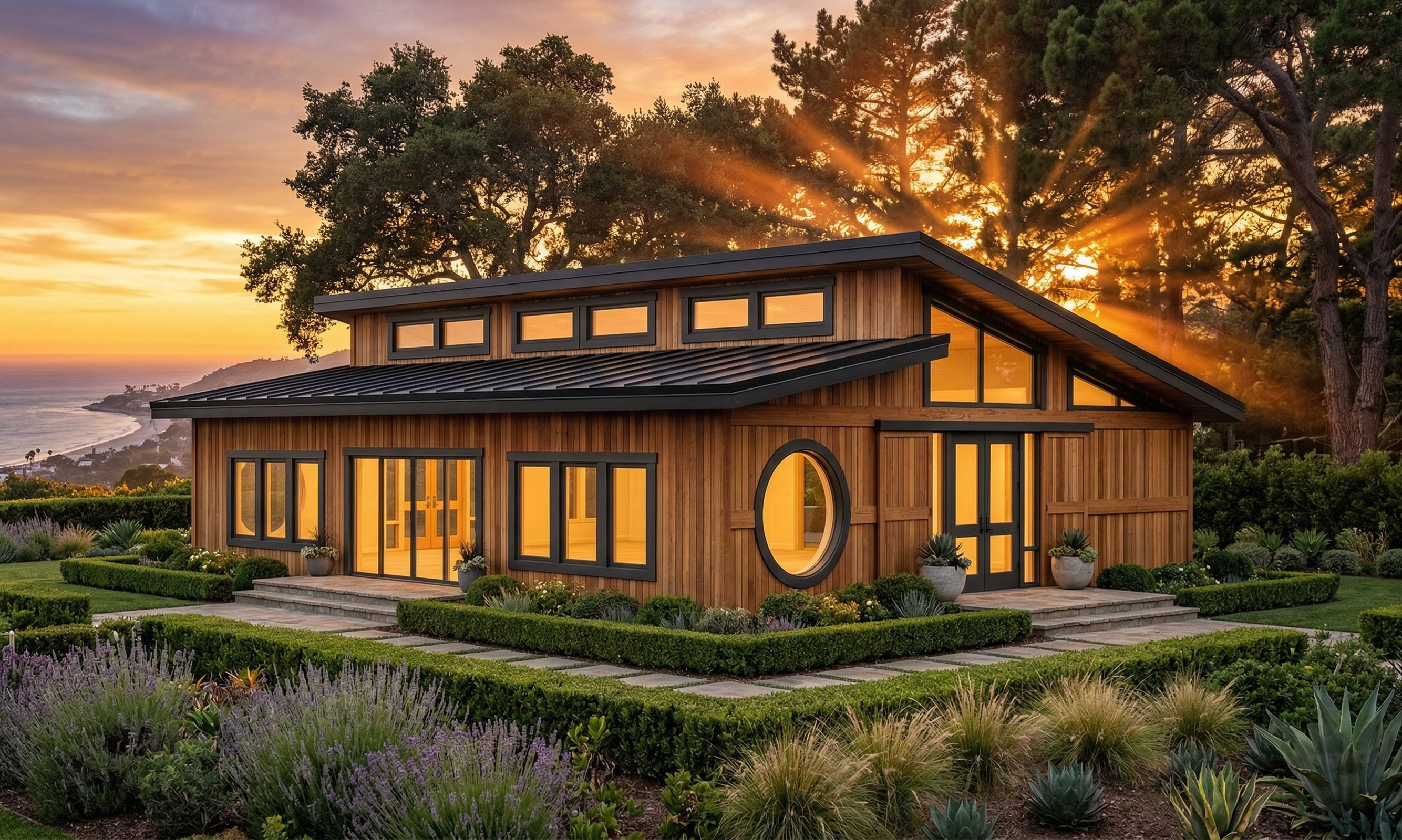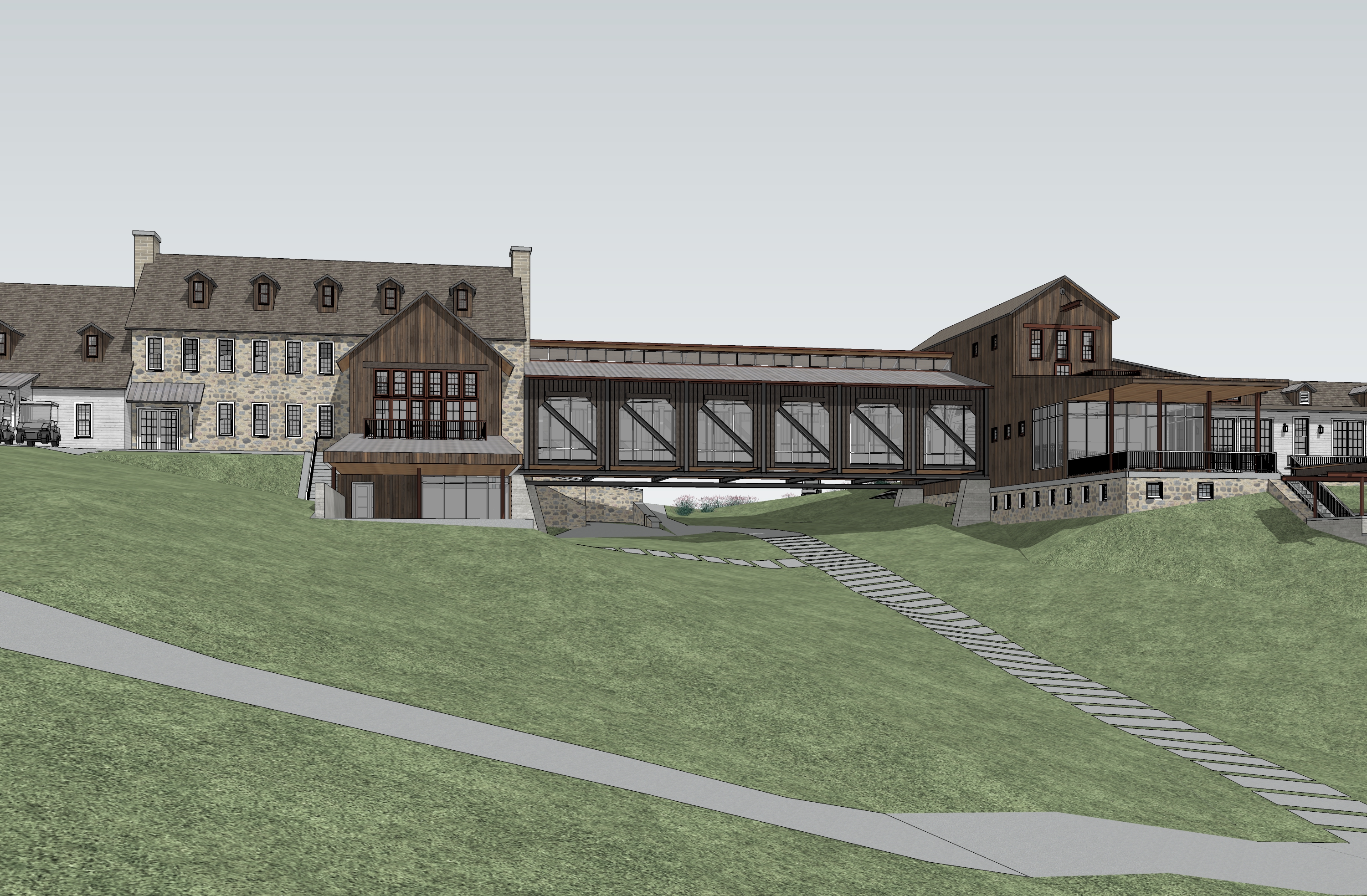 industrial design mill house with vertical matte wood shiplap steel bridge with wood slats old stone farmhouse with carriage house attached tall grass foreground trees in background sunlight on building face fog