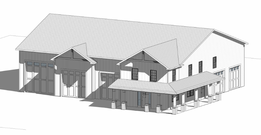 keep same aerial view make siding white with black trim and no stone create concrete driveways at both front and side garages