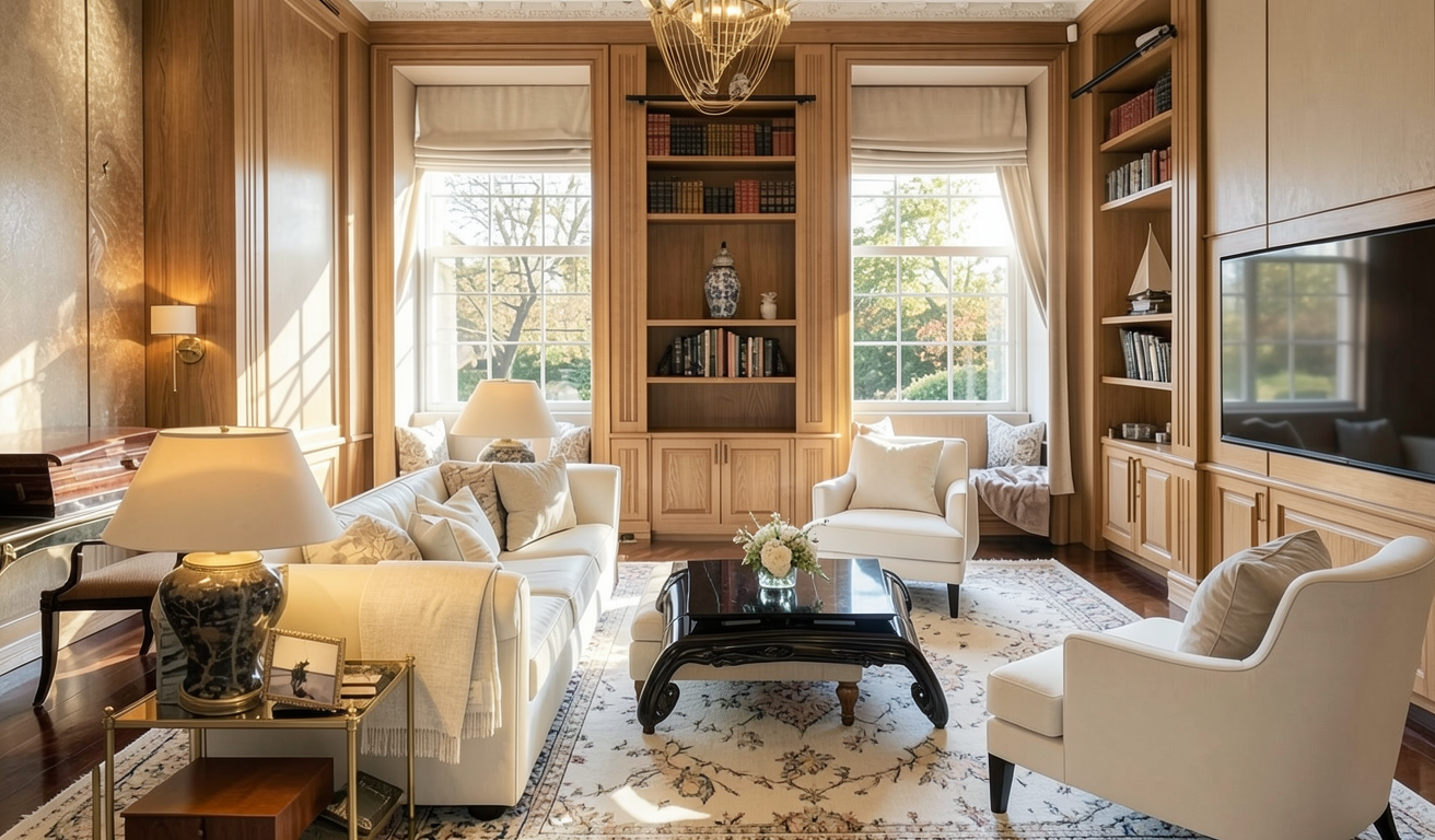 remove coffee table and also make the rug all white plain with embossed boarder around