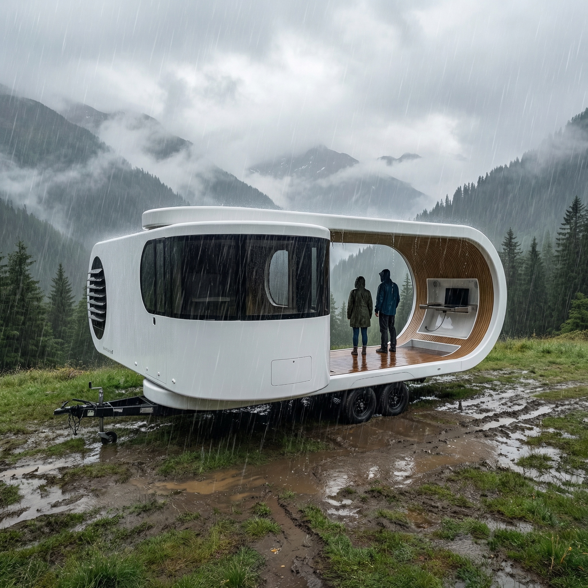 aerial shot rent this modern travel trailer overlooking a lake high in the mountains at dusk with an old man sitting on a chair drinking a glass of whiskey on the deck of the caravan architecture