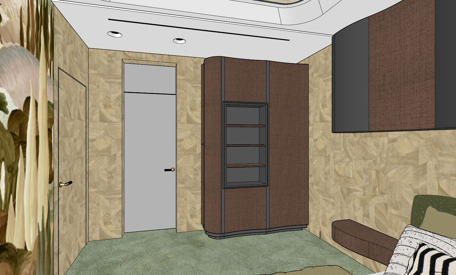 modernist interior shot render a modern bedroom with a calming and cozy atmosphere the walls should have a textured wooden pattern in light beige adding warmth and depth the bed is upholstered in olive green fabric with plush beige and striped black and white pillows enhancing comfort the bedding is crisp white with subtle grey patterns upper wall cabinets are sleek and contemporary combining dark brown and black finishes the floor has a soft muted green carpet large glass doors with sheer white curtains let in natural light creating an airy feel overall use soft earthy tones to create a serene and inviting environment architecture