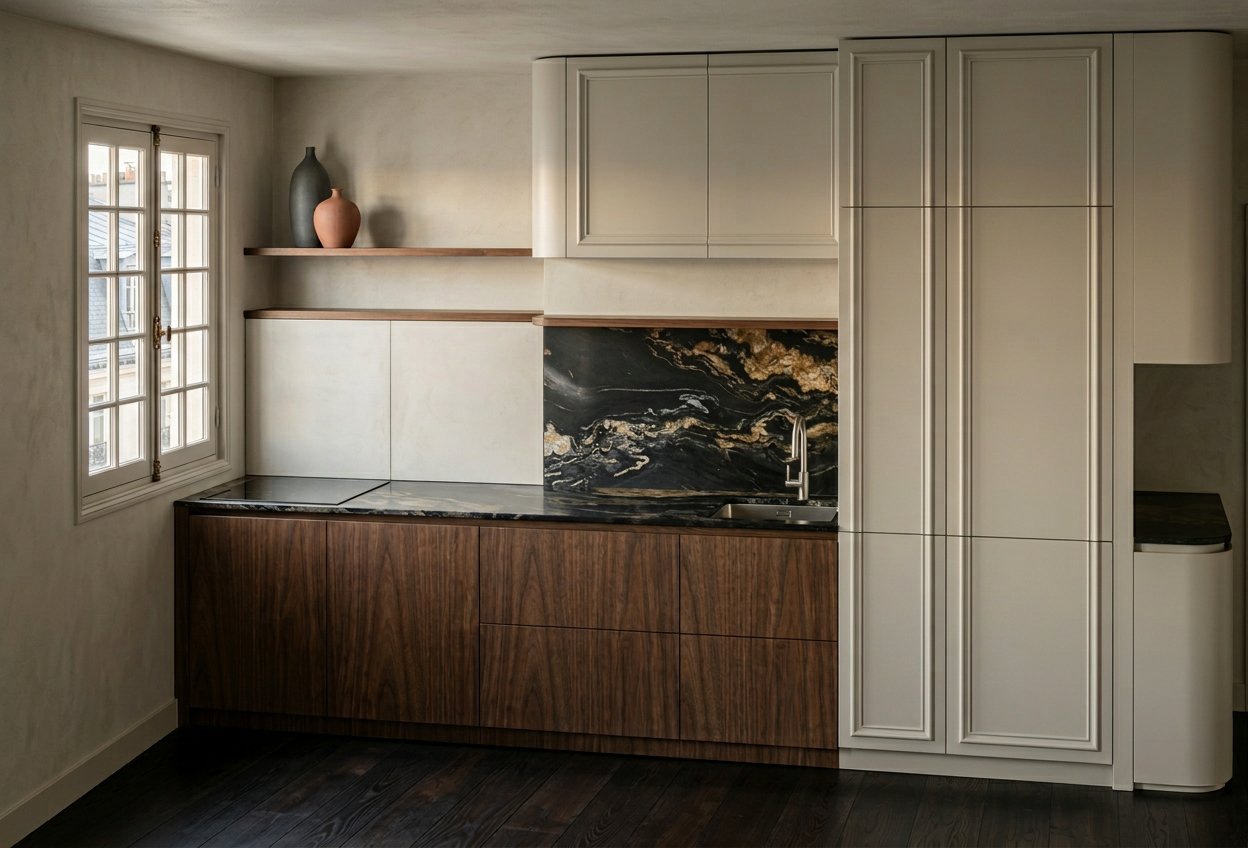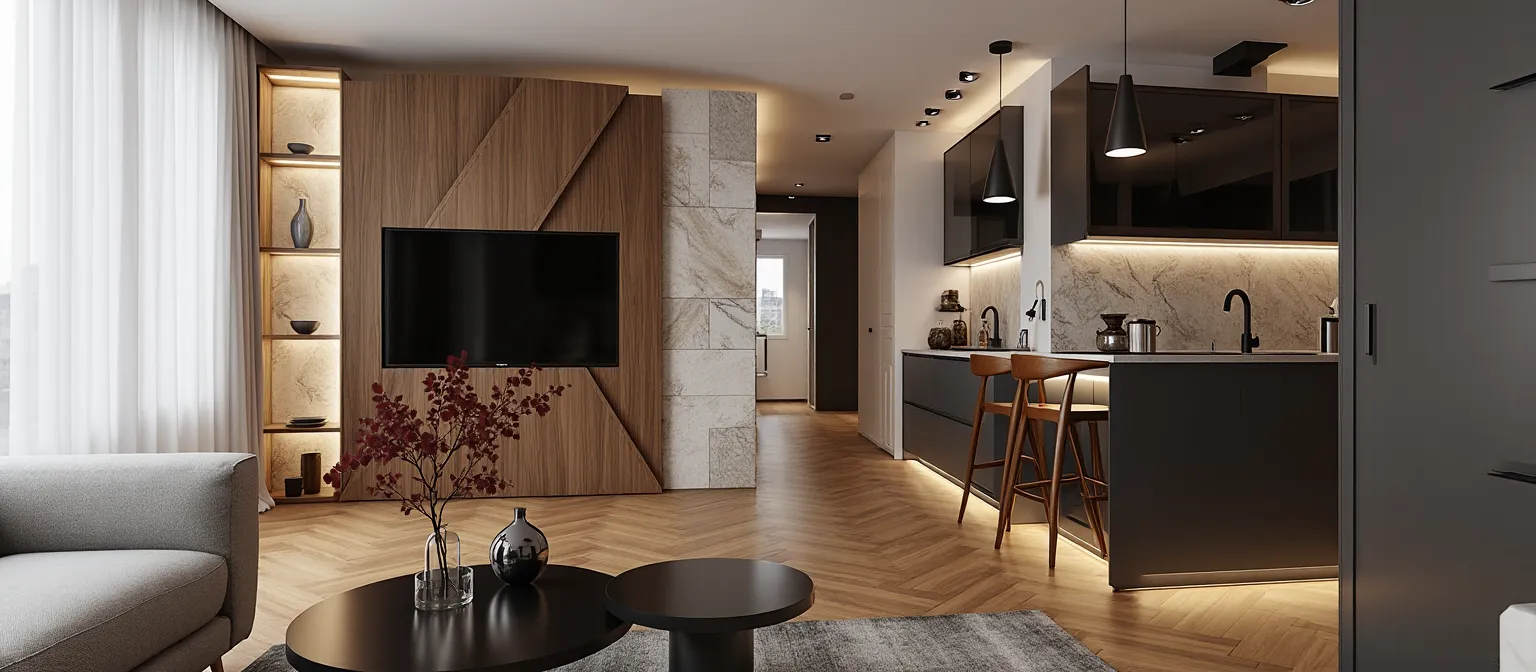 interior shot professional photorealistic office interior rendering modern open space workplace with dark walnut wood furniture and light wood accents perforated white plasterboard suspended ceiling suspended linear led lights with visible hanging cables exposed hvac ducts industrial style glass walled meeting rooms imac workstations cozy waiting area with beige armchairs potted plants in terracota pots dark gray matte epoxy resin flooring bright and clear atmosphere high key lighting abundant natural daylight from large windows architectural visualization high end corporate office design ultra detailed 8k resolution photorealistic materials realistic shadows and reflections professional interior photography style depth of field ambient occlusion global illumination