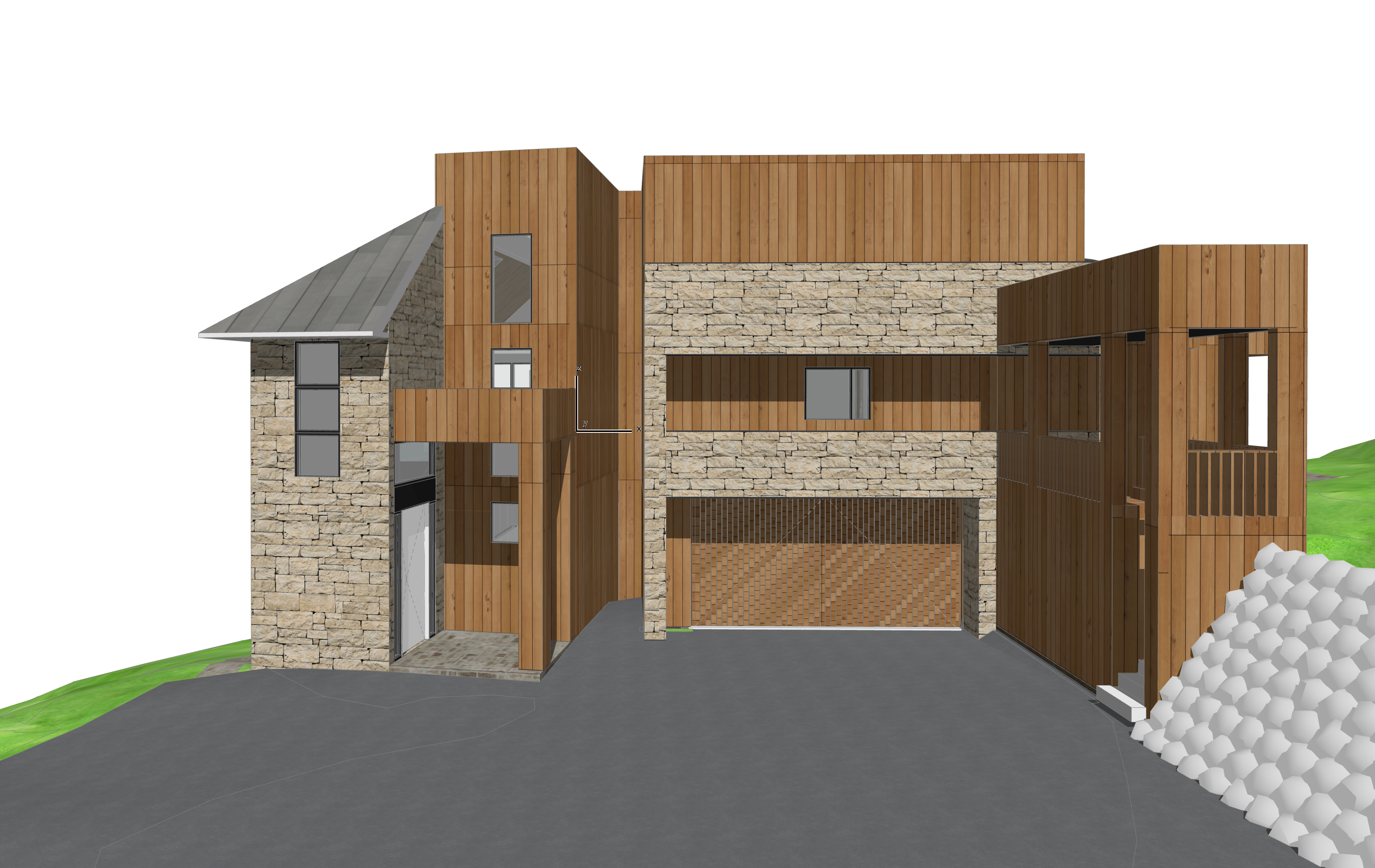 do not change the view maintain the current materials and make the landscape nicer vegetation glass reflections in the windows and a vibrant clear sky with light atmospheric depth render in hyper realistic architectural visualization quality 8k resolution render a photorealistic 3d perspective of this house in a snowmass co reference the current material style just enhance them brown standing seam metal roof contemporary light wood siding colorado buff rough limestone where shown make the wood siding have less knots and be lighter than the reference image keep model geometry the same windows doors roof walls garage door pavement driveway make a lush vegetation that looks native to snowmass co and adjust grey circles on right side of image to a boulder wall