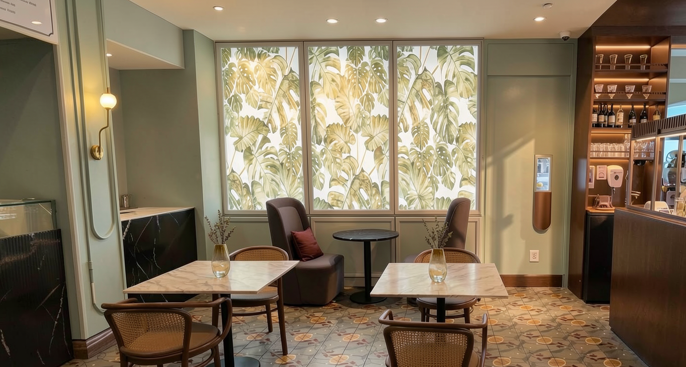 keep it exactly as it is just make it more realistic the leaves are wallpaper not windows keep them the exact color french bistro style