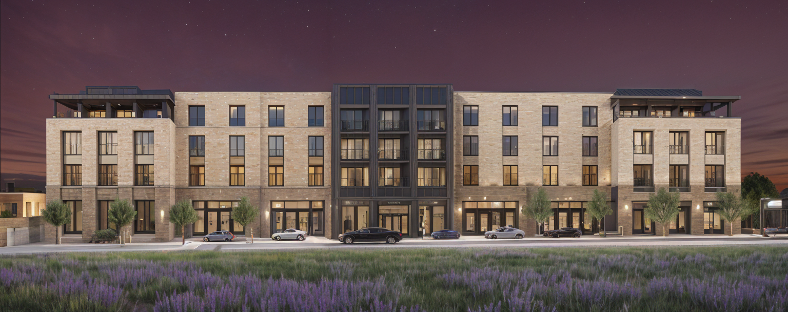 a industrial hotel in fort worth texas plaster and stone walls steel framed windows strong geometric forms rooftop terraces with greenery symmetrical fa ade and dramatic nighttime architectural lighting western traditional design architecture