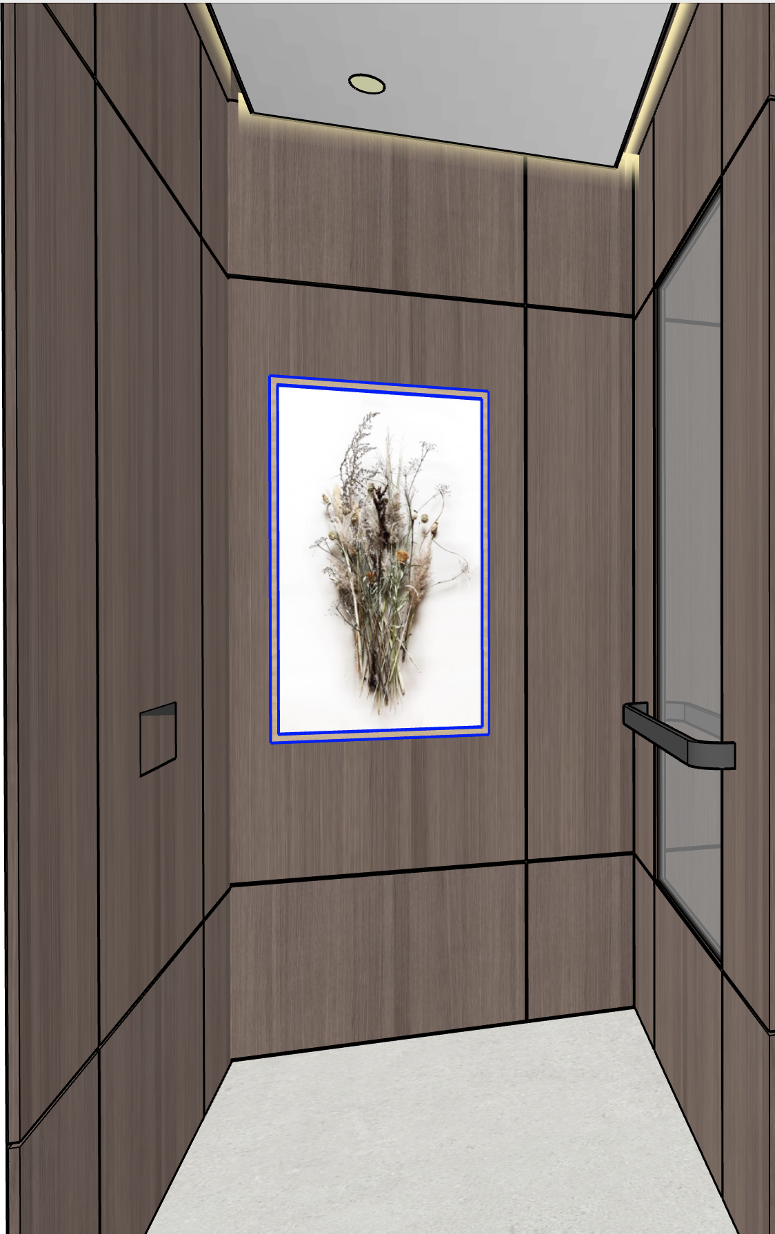sure here s a prompt for you render a modern elevator interior featuring wooden panel walls with a walnut hue complemented by ambient led strip lighting along the ceiling edges for a warm welcoming glow centrally displayed is a minimalist art frame showcasing a delicate bouquet of dried flowers highlighted by a subtle blue outline the ceiling is a dark grey mirror panel adding brightness while the floor is a soft gray stone enhancing the contemporary aesthetic the dark grey mirror on the right reflects a sleek modern design contributing to an overall sophisticated tranquil atmosphere