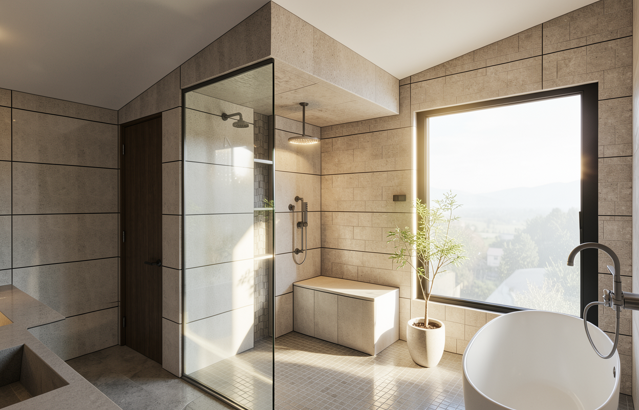 photorealistic enhancement of the provided architectural render preserve the exact architecture layout materials furniture placement and fixtures from the original image with no redesign or modifications the purpose is only to improve realism and lighting quality render as high end interior photography using a full frame camera with a 24 35mm architectural lens balanced exposure realistic dynamic range subtle depth of field and natural color grading the image should look like a professionally photographed luxury interior rather than a computer render soft natural daylight diffused window light global illumination balanced exposure do not change architecture do not change materials no redesign no new objects no additional lights no glowing fixtures no light from shower heads or faucets no dramatic shadows no surreal lighting no warped geometry no stylization the windows looking out to the exterior should be displaying mountains in the distance some trees the grout in the tile should be lighter in color the space should be well lit from can lights in the ceiling
