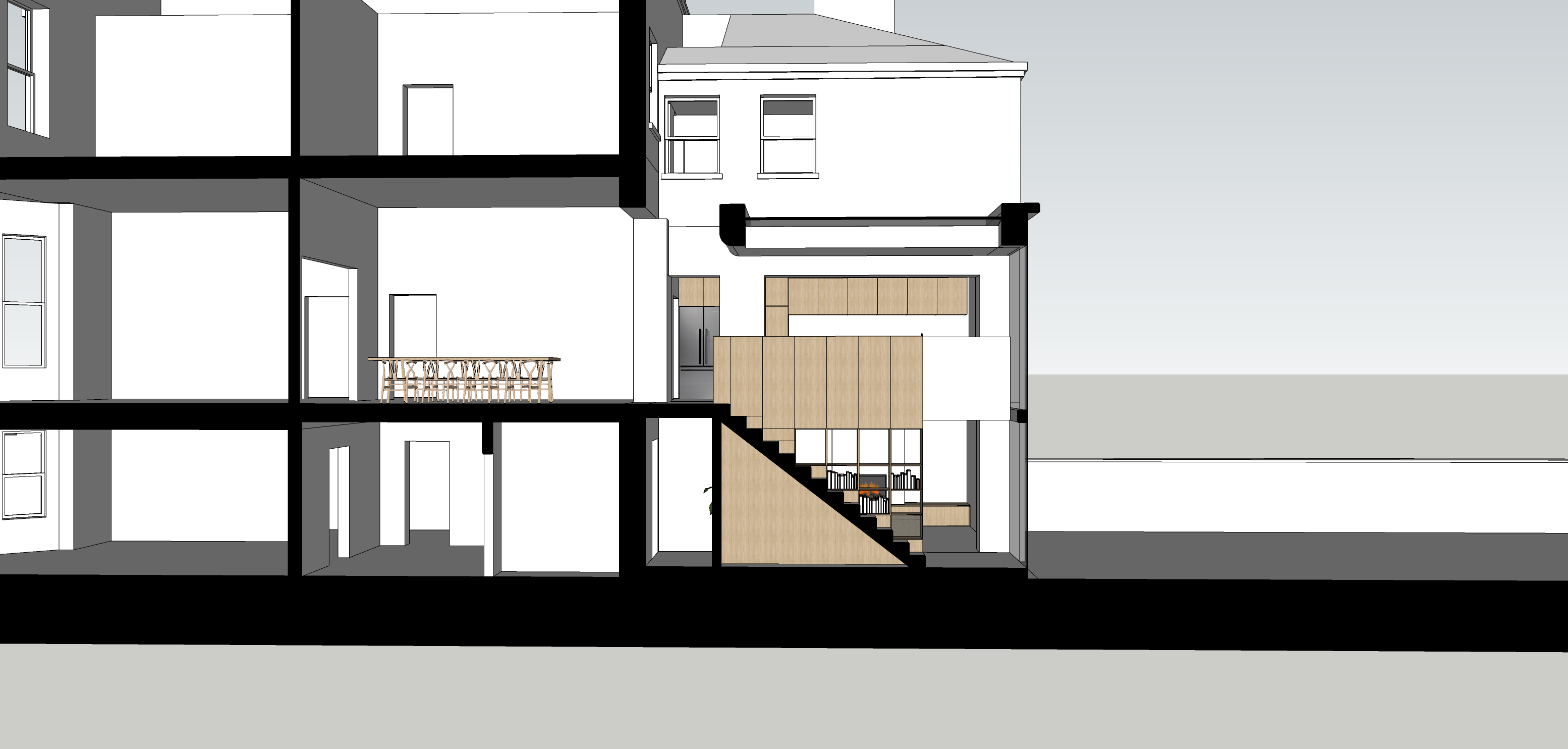 create a serene atmospheric perspective image with soft diffused lighting and minimal reflection the whole image is very light with lots of natural daylight inside the spaces there are feature items of joinery with matt pale oak panels and kitchen with white metal balustrading to the stairs a rooflight along the back of the building brings lots of natural daylight into the spaces the quality of the image is ethereal almost appears like an illustration with soft lighting and slight haze