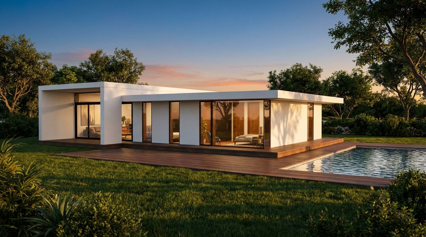 transform this architectural render into a highly realistic photograph of a contemporary villa located in ericeira portugal enhance realism in materials lighting and environment exterior walls in slightly textured off white mineral plaster subtle imperfections natural shadows mediterranean finish natural wooden cladding elements in warm european oak or thermally treated pine slightly sun weathered by coastal climate pool water with realistic depth subtle movement light reflections and natural imperfections pool surround in light limestone or portuguese lioz stone add soft coastal sunlight typical for western portugal late afternoon golden hour realistic long shadows slight atmospheric haze from atlantic air landscape adjustments native portuguese vegetation olive trees agave lavender coastal grasses slightly dry mediterranean lawn not overly perfect distant rolling hills typical of ericeira region subtle atlantic coastal mood interior visible through glazing warm indirect lighting natural wood furniture linen fabrics soft lived in feeling realistic reflections and slight glass glare lighting physically accurate natural daylight realistic shadow softness slight lens imperfection subtle photographic depth of field camera architectural photography style 35mm lens natural color grading no cgi look ultra realistic high detail professional architectural photography