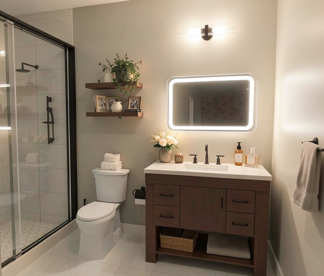 visualization of home fitness do not change any proportion the window frames brown wood with natural light streaming in through the large windows new wall panel with shelves for fitness staff oak matt big boards ceiling stright next to the panel oak creating c shape form of the wall panel put some small kettlebels on lower shelves 2 towels above 2 jogamats rolled on shorter shelves next to the tv and hang 1 jumping rope on hang on the right side of the flat tv make ambient light there is soft led lights under the shelves and 4 round light on the oak ceiling