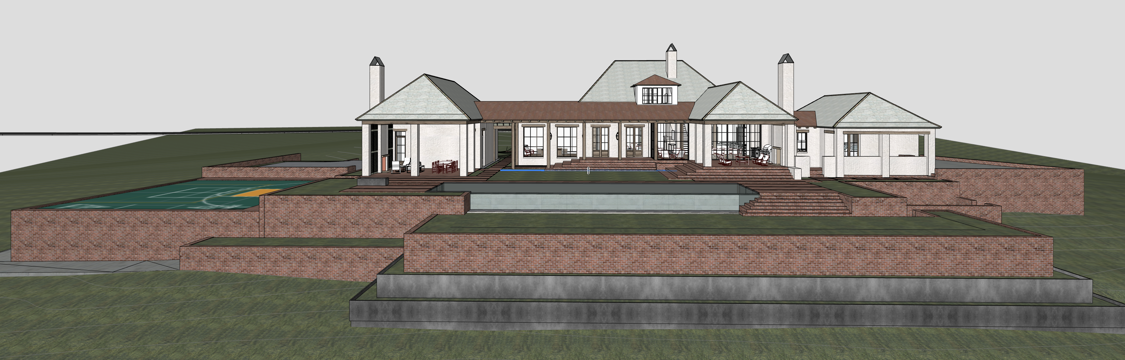 white lime washed brick waters edge and manicured grass in the foreground slate roof trees in the background to the right