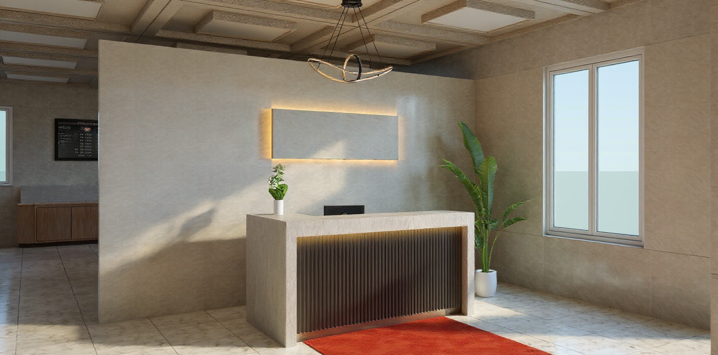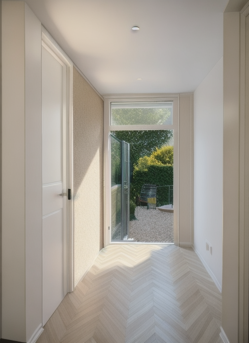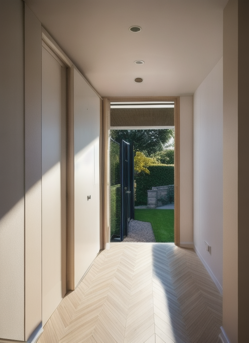 sliding doors on the left with beige color floor texture with bigger planks grass garden floor window frame white tree on the front opening architecture