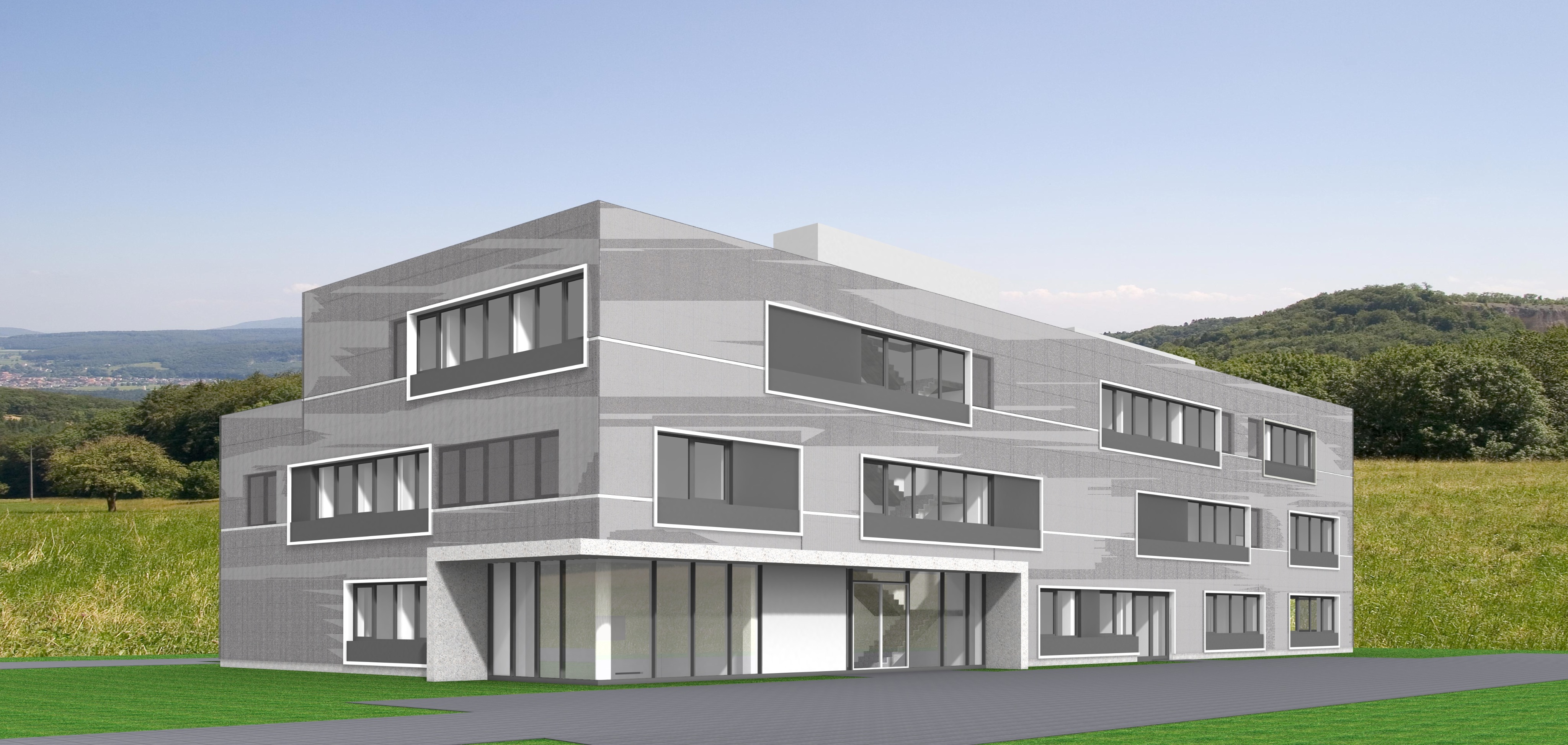 create a photorealistic architectural render of the provided building while preserving the exact geometry proportions facade rhythm openings roof form and camera angle from the source image do not redesign the architecture use an aluminum facade with base color ral 9006 throughout the main facade surface must be executed in perforated corrugated metal in ral 9006 all facade frames must be finished in ral 9006 all window frames must be finished in ral 9006 all other closed facade infill panels must remain solid smooth and non perforated in ral 9006 the rooftop structure roof extension must likewise be finished in ral 9006 apply the perforated corrugated metal finish only to the main facade surface while preserving the exact facade composition panel layout openings and proportions the canopy must be expressed in exposed concrete the wall below the canopy must also be in exposed concrete the round column underneath the canopy located at the building corner behind the glazing must remain clearly visible through the glass and must also be finished in exposed concrete arrange a small clearly organized parking area in front of the right side facade of the building show only two to three cars in total all cars must be parked exclusively within this parking area and always orthogonally to the facade at a strict 90 degree angle the cars must be aligned neatly in clearly readable parking bays no diagonal parking no parallel parking no random vehicle placement no overlapping cars no distorted vehicles and no cars on grass planting areas or pedestrian paths add only very few people to the scene placed subtly and realistically in plausible pedestrian areas such as near the entrance or along the forecourt the people must remain secondary to the architecture create a friendly and slightly warmer summer atmosphere with a calm elegant and inviting competition style architectural ambiance the overall environment should feel more welcoming pleasant and human centered while remaining refined and realistic in the background show a flat commercial area with low rise warehouse buildings and simple industrial halls understated and secondary to the main building on the left side in front of the building there must be only a green grass area with no street no road and no sidewalk close to the building itself include a few trees and restrained planting to create a greener softer and more welcoming immediate setting keep all planting clearly separated from paved circulation and parking areas use soft neutral summer daylight with diffused light very gentle shadows and balanced exposure minimize direct sunlight on the facade keep reflections very soft and controlled the facade should remain evenly lit clearly readable and free from harsh glare bright specular highlights or strong reflections no morning light no evening light no golden hour no sunset mood and no dramatic sky the final image should be refined realistic professional welcoming and suitable for a high end architectural competition presentation no redesign no changed geometry no changed panel layout no changed facade rhythm no distortion no warped perspective no exaggerated reflections no harsh facade glare no oversaturated colors no clutter no dramatic weather no overcrowded scene and no street or sidewalk on the left side in front of the building