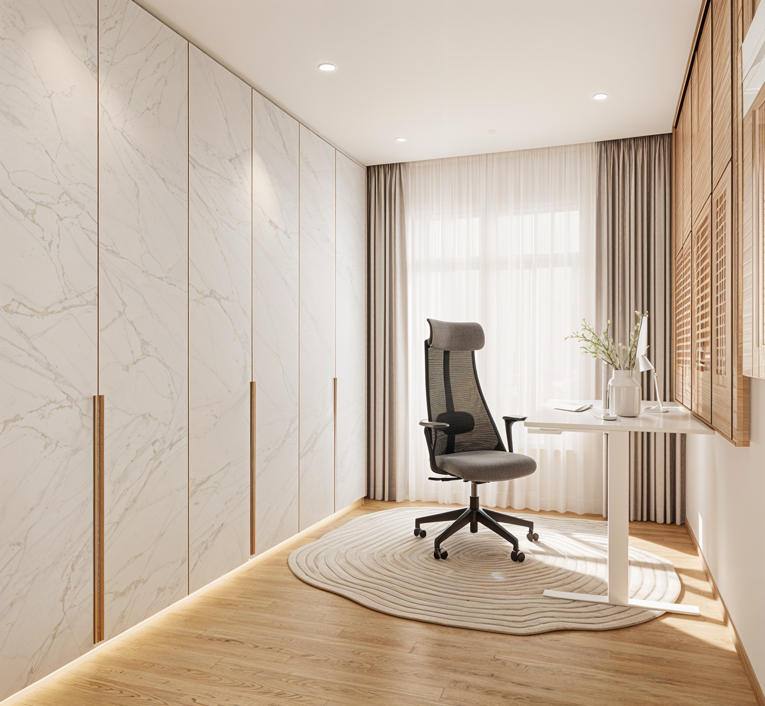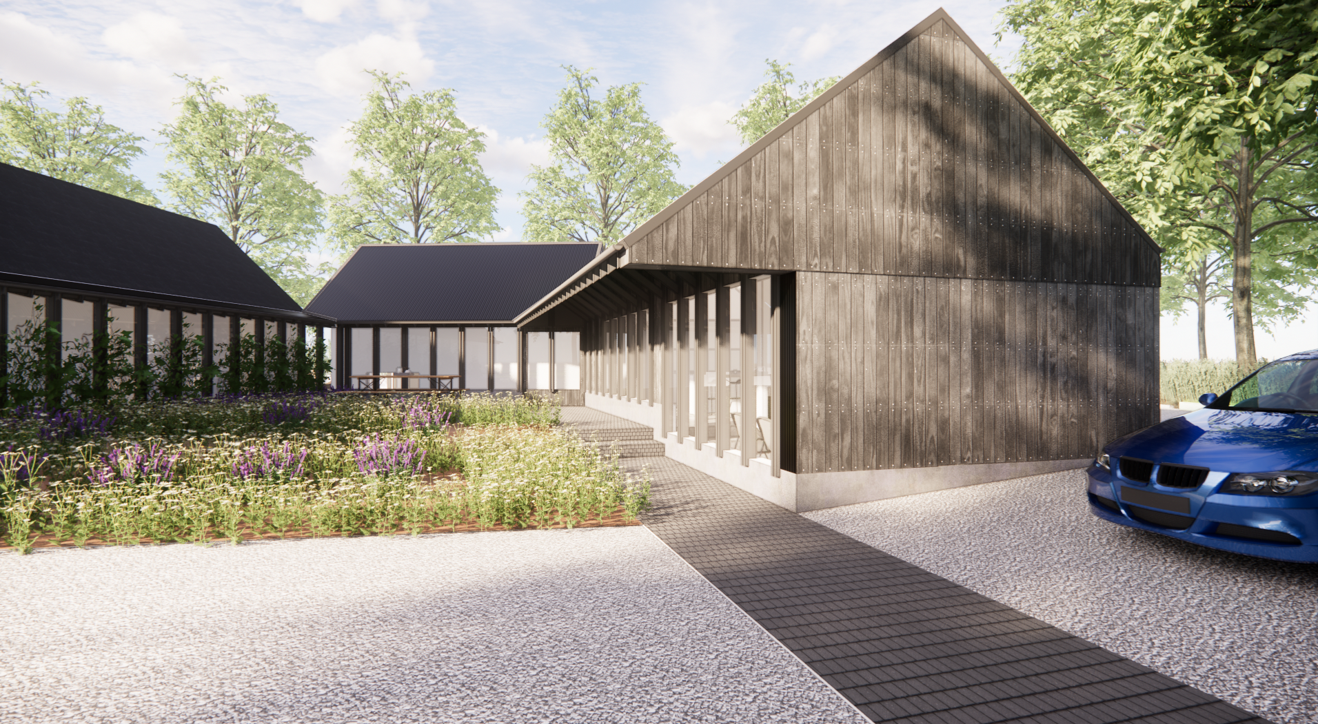 granite cobble path black vertical timber cladding slate roof on the left black corrugated roof in the centre covered walkway to cobble path