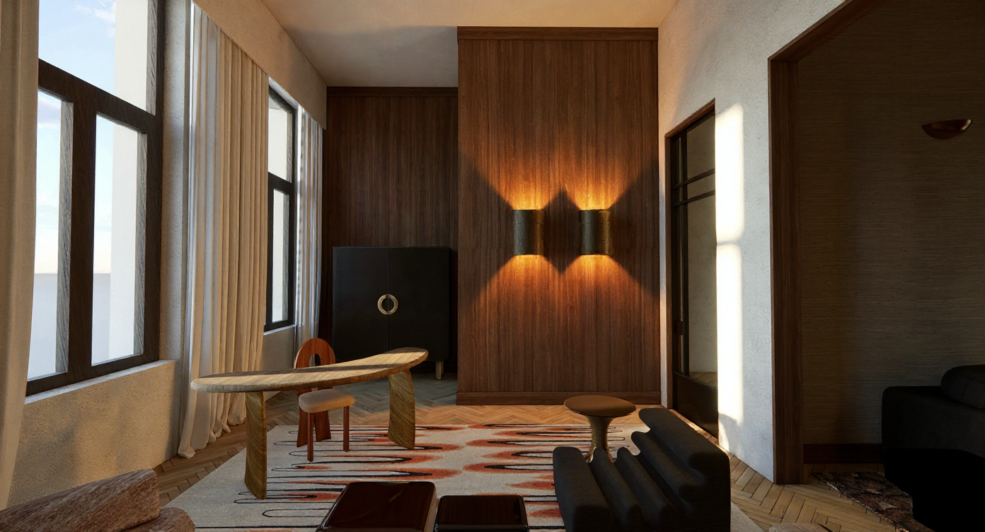 enhance the render realism without changing the design improve the lighting with natural soft shadows and balanced exposure increase realism and material detail on the desk legs by adding a shiny polished brass finish with noticeable reflections overall increase realism depth and detailed material quality while keeping the original design exactly the same