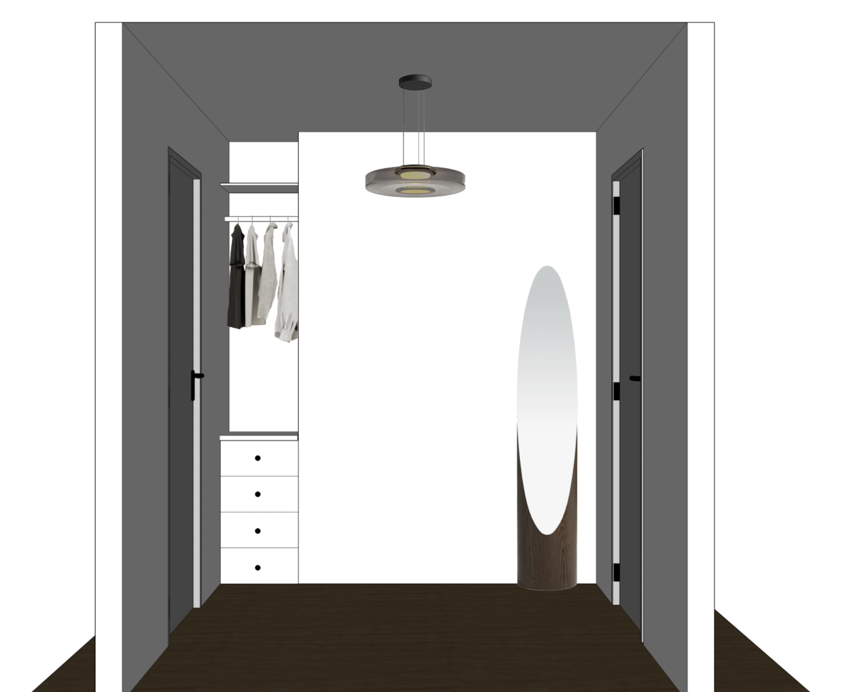 render my image walls are medium grey drawers ont he back left wall are same grey as the wall and built in light from the ceiling light add grey patterned rug to the floor add upholstered grey ottoman bench to back wall next to the mirror