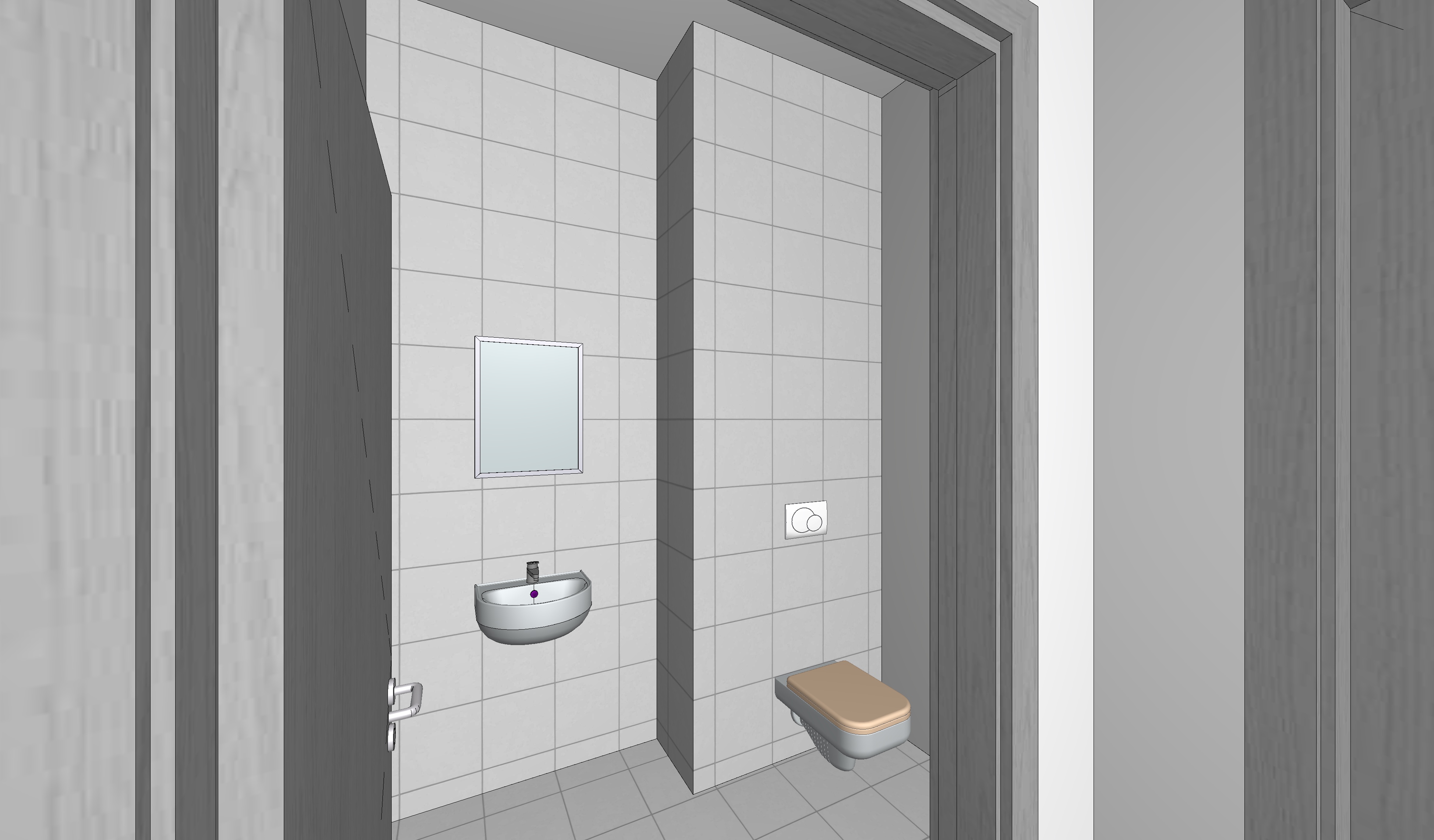 create a clean highly realistic architectural render of a small modern bathroom the floor is covered with 30x30 cm dark grey ceramic tiles all walls are fully covered with 30x30 cm dark grey ceramic tiles the same tile format as the floor the tiles cover every wall surface from floor to ceiling including all visible wall faces and the sides of the partition wall subtle grout lines and a slightly matte finish layout on the left wall a small wall mounted round sink with a minimalist chrome faucet above the sink a simple rectangular frameless mirror on the right side a wall hung toilet with a concealed cistern and a light beige seat a small partition wall separates the toilet from the sink area and this partition wall is also fully tiled on all sides with the same 30x30 cm dark grey tiles a modern flush plate is installed on the tiled wall above the toilet style minimalist contemporary bathroom clean lines dark grey tiles contrasted with white ceramic sanitary fixtures lighting and render soft natural lighting realistic shadows global illumination physically accurate materials photorealistic architectural visualization high detail 4k render