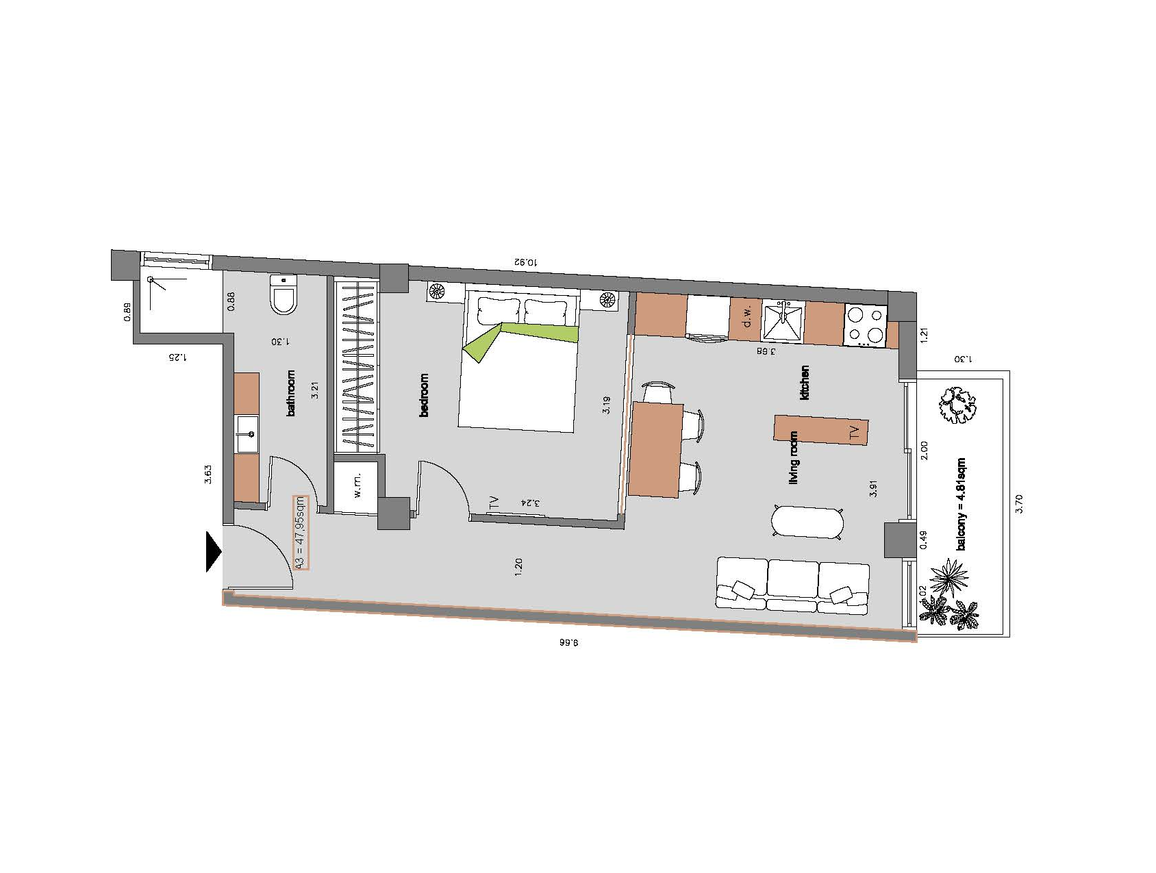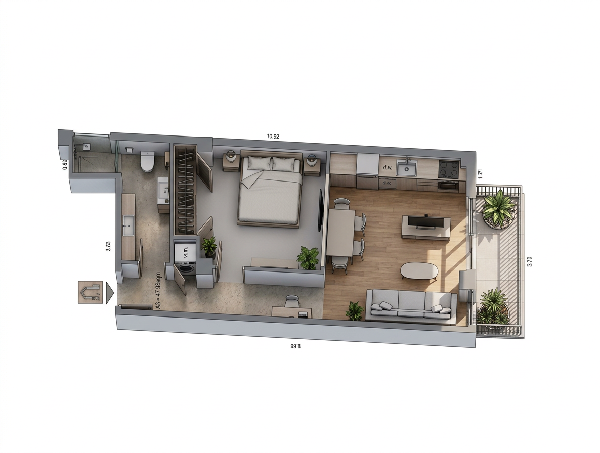 convert this floor plan into a architectural isometric 3d view of a full house show the space from an elevated angle with furniture walls and details visible keep exact measurements and lay out floor is clear with no tiles lighting is always from the top use the same furniture as shows on the plan do not change the orientation of the floorplan