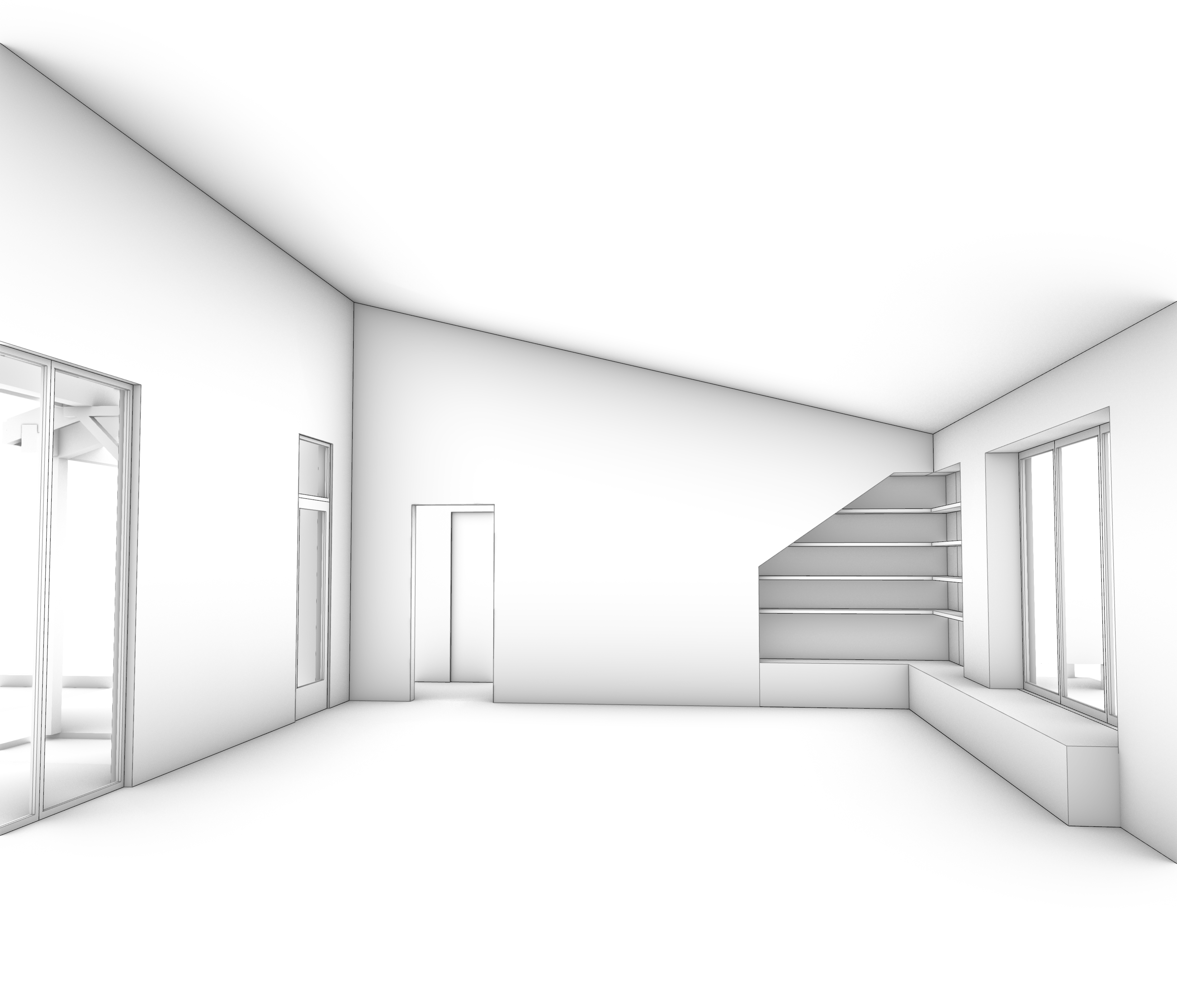 contemporary interior shot render a living room with wood bookshelf and window bench a tv located on the wall in front and a wood burning stove along the wall to the left fill with contemporary sectional sofa architecture