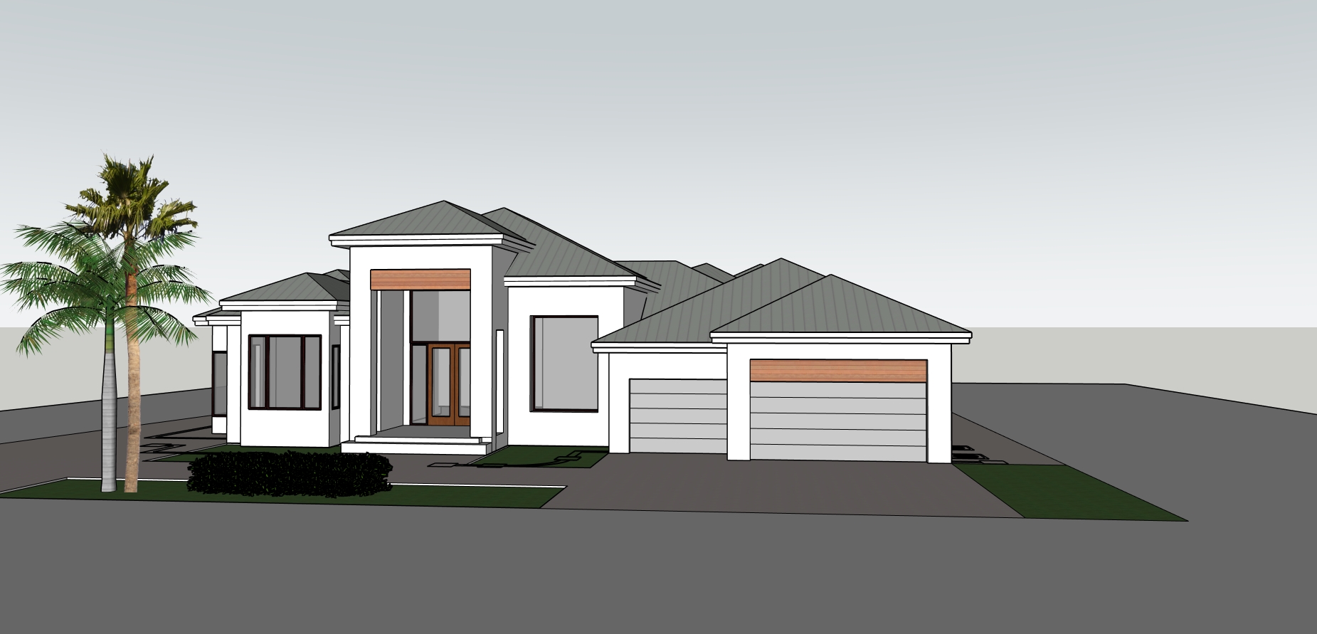 a florida modern house facade with a tropical ambiance create a realistic rendering of a contemporary house featuring white exterior with shades of darker gray for the roof incorporate large windows with sleek bronze frames keep original window frames the front door should have warm wood tones the garage door is gray and there is a horizontal wood accent above it and above the front entrance add lush green palm trees and bushes in the front yard with vibrant grass the sky is clear with a subtle gradient from light blue to soft white the overall atmosphere is tranquil and inviting bathed in soft natural sunlight keep geometry