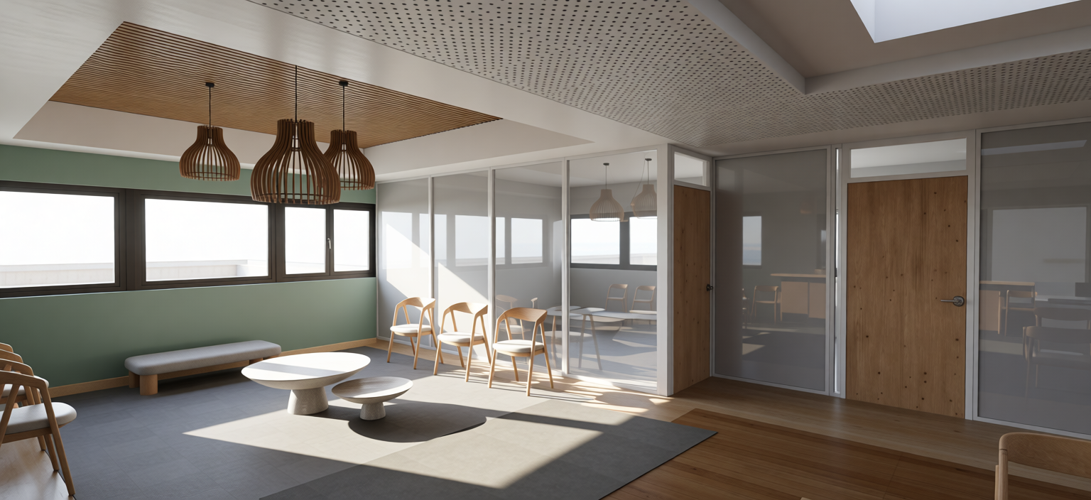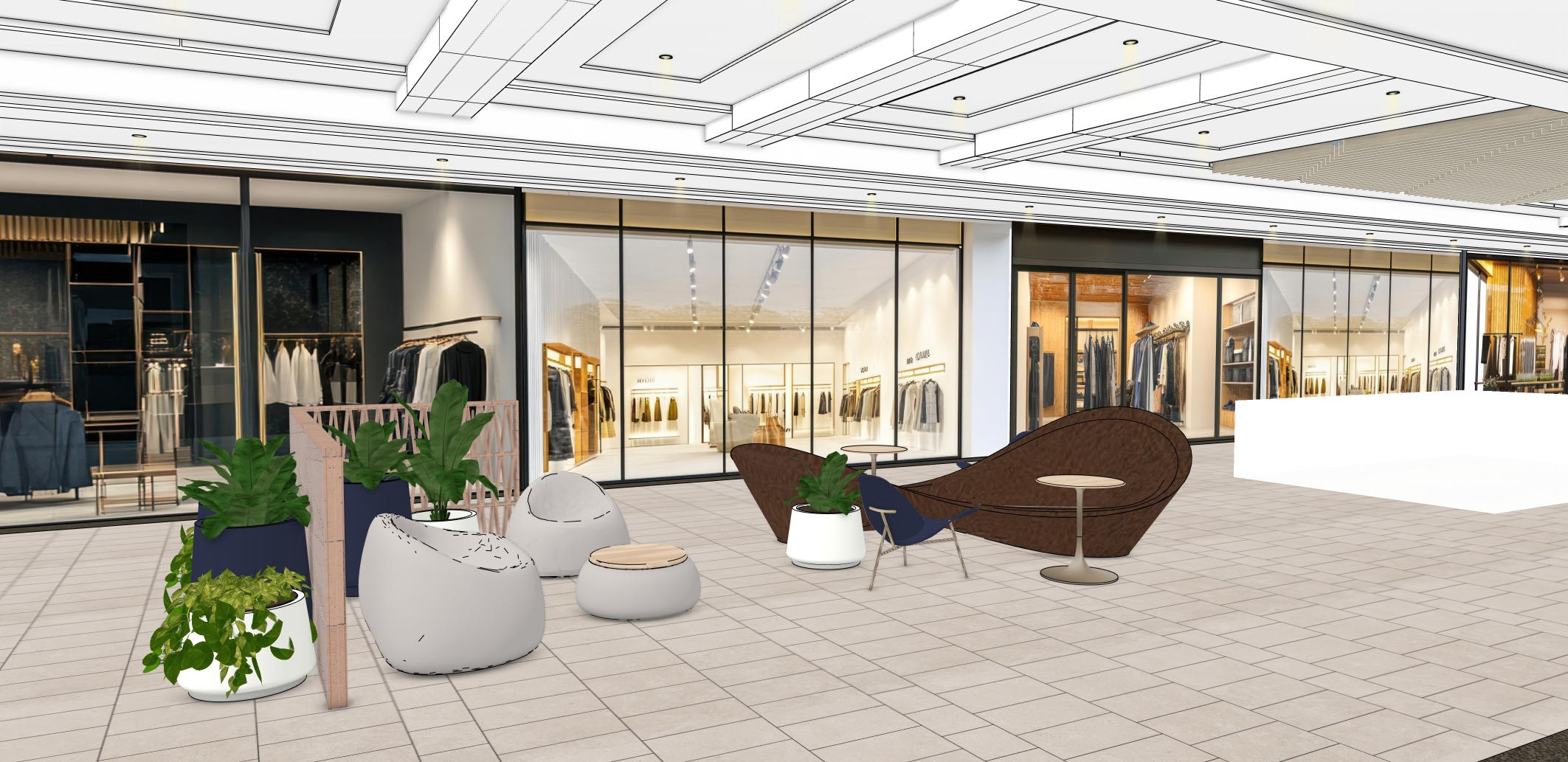 stylish modern indoor shopping centre with a sleek design and a luxurious atmosphere satin finish tile floors in soft beige tone storefronts feature large framed glass windows showcasing elegant displays overall the ceiling should remain white ambient lighting cast a warm golden glow keep the material color finishes texture and shape add shopping people in render the inviting and sophisticated mood do not change the furniture texture and color it should be plastic do not change the model white box remain as it is shopping people should walk around the background add people seating in the chair or bench