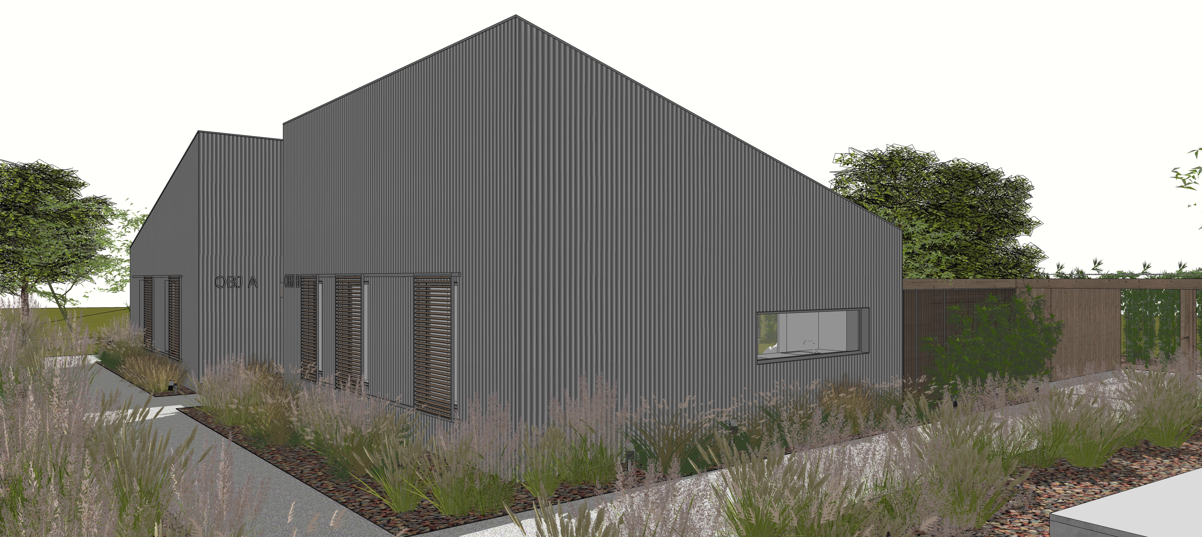 a matte finished light grey corrugated metal fa ade grey painted sliding shutters with a steel frame and timber slats sky with little clouds summer midday