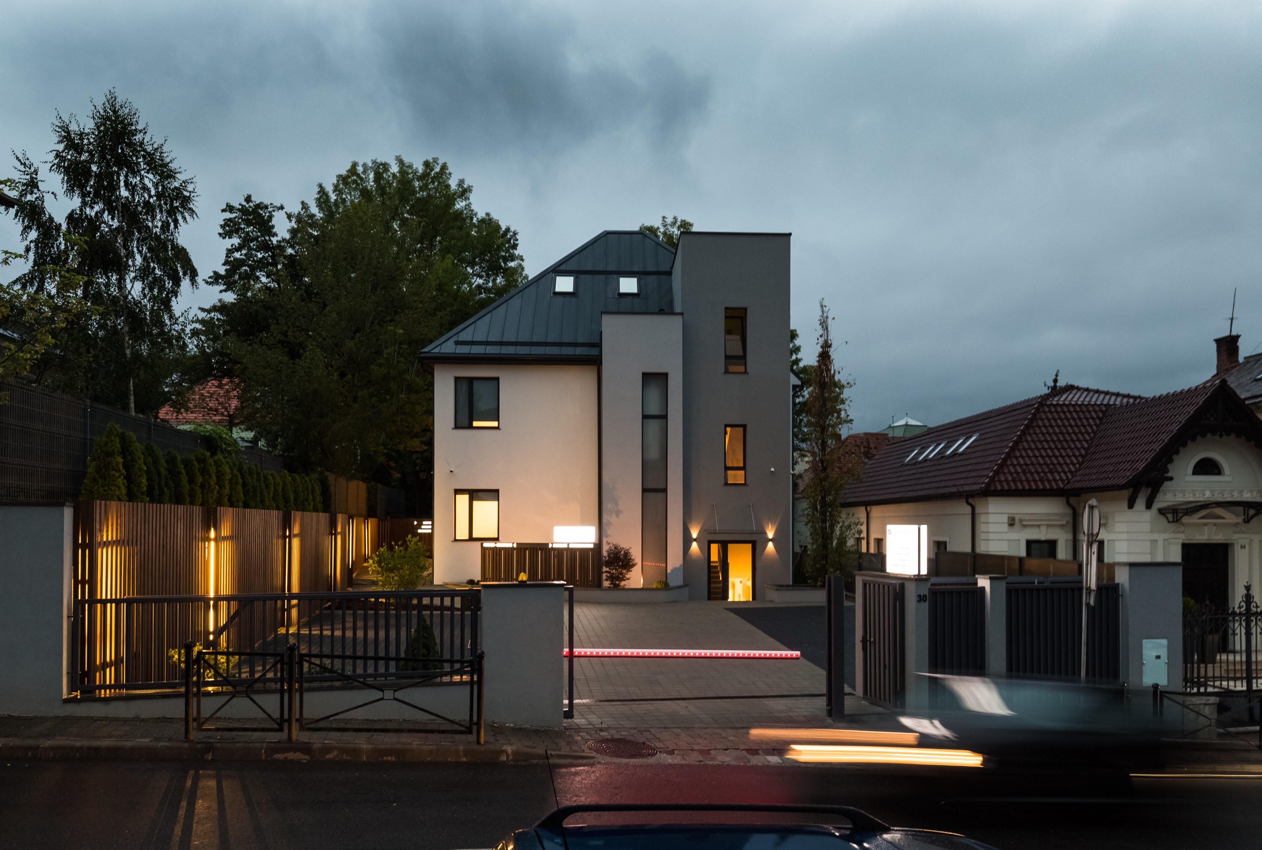 important preserve the existing geometry and the existing context exactly as provided preserve the existing windows do not add new windows do not modify alter reinterpret add remove scale or reshape any geometry do not change the site surroundings street layout neighboring buildings vegetation or context elements do not modify geometry scale proportions buildings road layout sidewalks or surrounding context in any way do not modify text soft noon atmosphere diffused neutral natural daylight with subtle tones cinematic architectural mood weak interior lighting 4000k slight glowing from inside large glass surfaces with realistic reflections soft mirror effect environmental reflections of sky and surroundings important do not add new windows wet asphalt