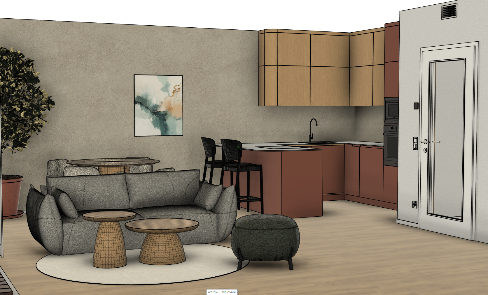 modify the image while strictly preserving the original composition camera angle layout furniture positions proportions and overall color palette sofa change the texture of the sofa armrests so that they have exactly the same fabric texture and color as the main sofa upholstery remove the white textured boucl material on the armrests and replace it with the same grey sofa fabric as the seat and backrest the sofa should appear as one continuous uniform material kitchen led lighting extend the led strip lighting under the upper kitchen cabinets so that it runs continuously along the entire length of the kitchen the led lighting should illuminate the full backsplash and countertop evenly not just the section above the sink the light should be soft integrated and realistic backsplash wall material change the backsplash and wall surface in the kitchen so that it uses the same plaster texture as the wall on the left side of the room the kitchen wall should have the same warm beige decorative plaster finish with subtle natural variations and soft texture matching the left wall exactly
