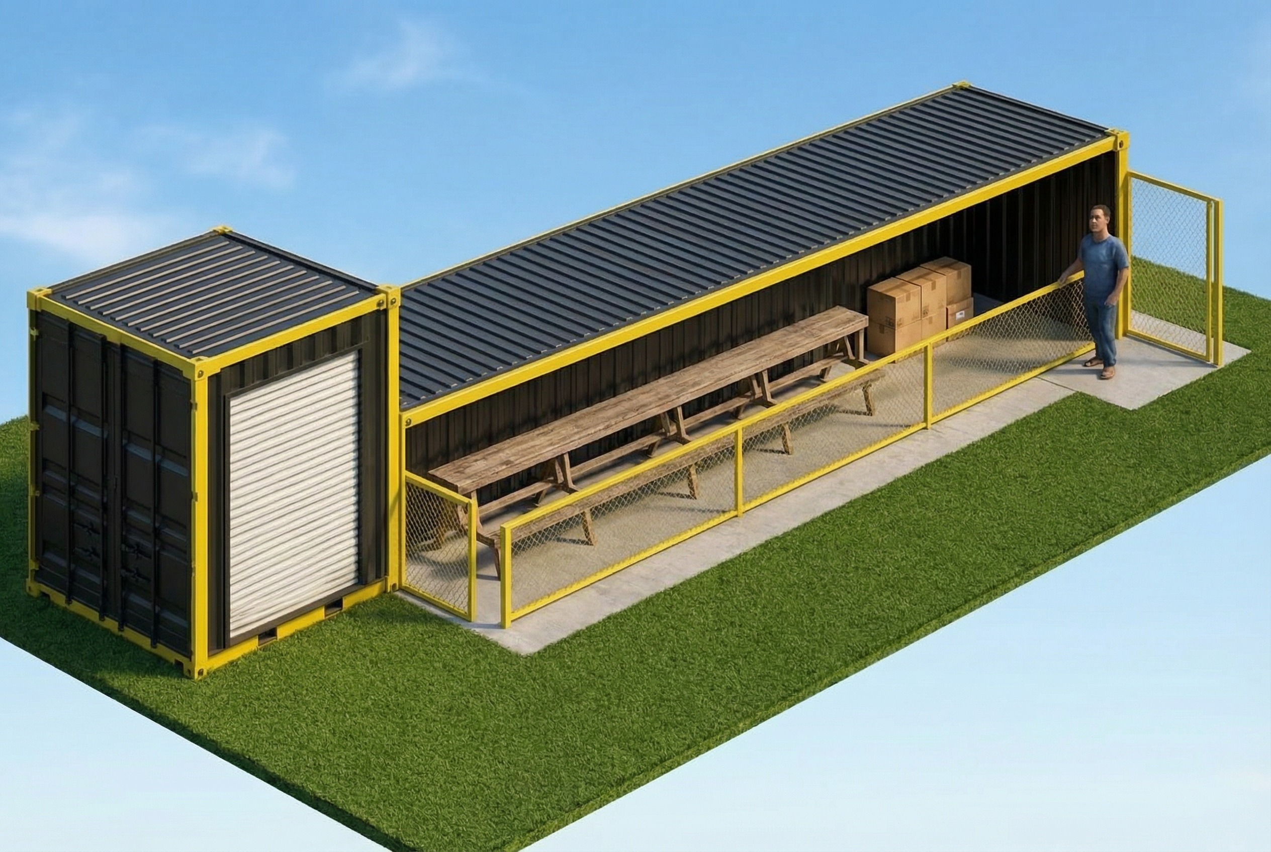 exterior shot render a detailed shipping container structure with a sleek modern design use a dark charcoal color for the container walls contrasted with vibrant yellow edges for a contemporary look the roof is also charcoal providing a unified appearance the roll up door is bright white standing out prominently the fencing and gate are galvanized steel adding industrial charm the interior includes wooden benches and tables in natural wood tones set the scene on a lush green lawn with a soft blue sky overhead and create a calm sunny atmosphere for an inviting outdoor space make the ground area around the dugout a baseball field so it looks like it s realistically placed where a dugout normally is