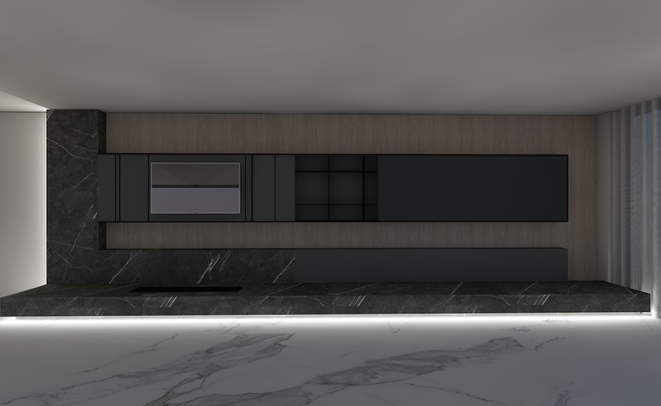 a high end living room composition with a strong emphasis on clean geometry premium materials and a dark luxurious palette the main elevation features a custom built wall unit spanning the entire width the base is defined by a continuous low profile structure in matte black seamlessly integrated with a black marble surface with subtle white veining extending horizontally to create a monolithic effect centered beneath the tv a linear bioethanol fireplace is recessed into the base element expressed as a sleek black rectangular opening adding a refined and minimal focal point above the composition is divided into horizontal layers a light tone wood panel runs across the top and midsection adding contrast and depth the central shelving area consists of open compartments made of black metal with a minimal thin frame construction giving an industrial yet elegant character on the right side a reflective rectangular surface is introduced using black tinted frosted glass creating a subtle mirror effect with low transparency and a soft diffused reflection frosted the cabinetry is finished in a combination of matte and satin dark tones charcoal to deep black with handle less flush surfaces to maintain a seamless aesthetic on the left side a vertical black marble element frames the composition visually anchoring the design the floor is finished in large format white marble carrara with soft grey veining enhancing the contrast with the darker wall unit lighting should be soft and indirect with hidden led strips accentuating the horizontal lines and material transitions creating a warm atmospheric glow that highlights the textures without overpowering the composition overall mood elegant minimal and exclusive a balance between contemporary luxury and architectural precision