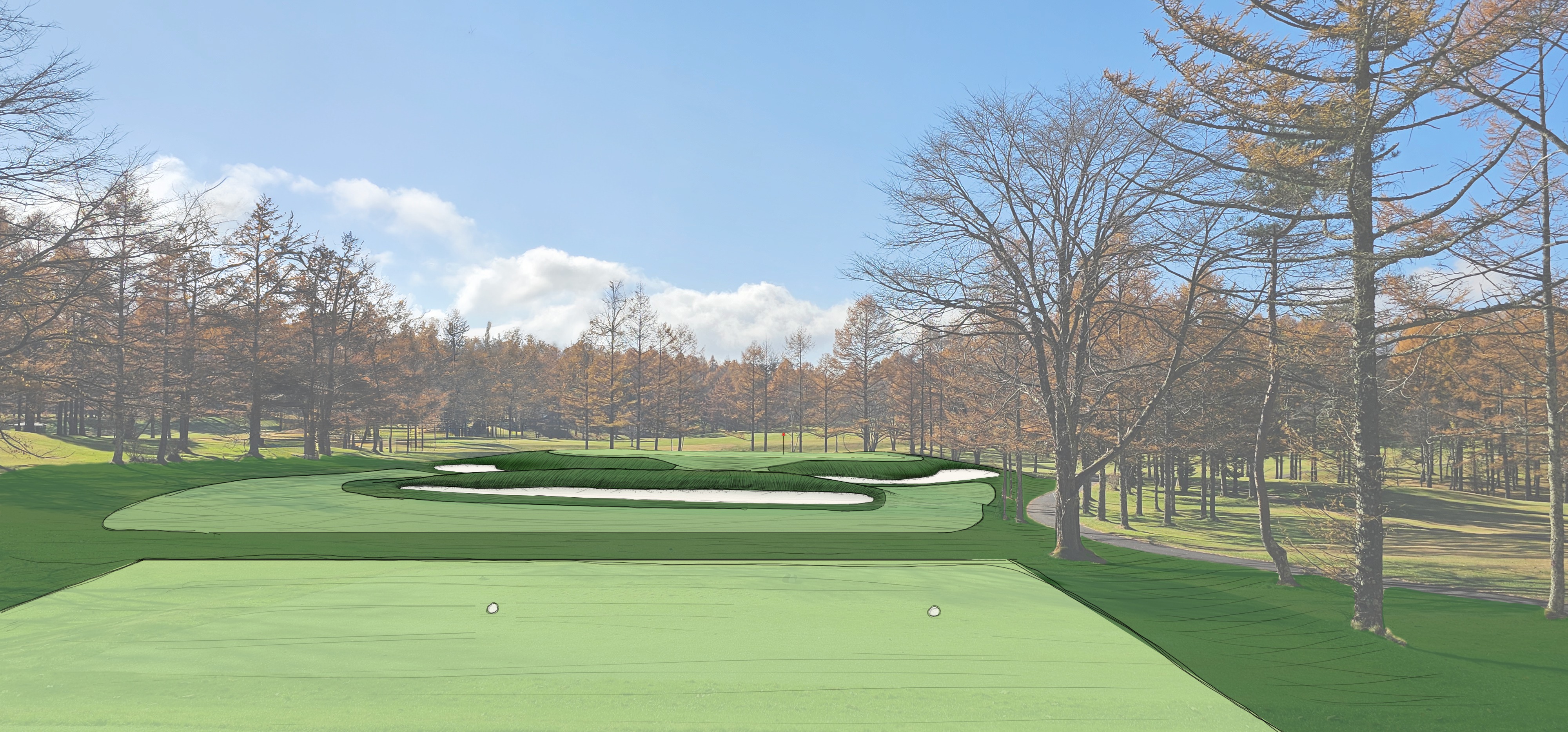 convert the provided golf hole photograph with sketch overlay into a hyper realistic photographic rendering of the proposed design preserving the exact geometry proportions and placement of all designed features the sketch overlay represents the final intended design and must be rendered exactly as drawn replace all sketched turf bunker and green surfaces with high fidelity photoreal materials that integrate seamlessly into the existing landscape and lighting conditions of the original photograph enhance overall image quality by carefully improving brightness contrast exposure tone balance color accuracy hue saturation and light distribution while maintaining a natural believable daylight appearance avoid over processing or artificial vibrancy render all maintained turf as healthy well established zoysia grass typical of a premium golf course in japan medium fine texture rich but natural green color slightly lighter on fairway surfaces and subtly darker on green surrounds turf should show gentle mowing patterns and realistic surface variation not uniform flat color greens should appear firm refined and subtly contoured with short cut zoysia texture appropriate to putting surfaces in japan bunkers must be rendered in the architectural style of seth raynor and charles blair macdonald with slightly geometric intentional edges bold clearly defined forms that feel engineered while still integrating naturally into the surrounding turf sand color should be light clean and consistent with traditional raynor macdonald presentation preserve all existing trees background landscape sky conditions and perspective exactly as shown in the base photograph lighting direction shadow length and atmospheric conditions should remain consistent only refined for realism and clarity the final image should read as a true photograph of a built golf hole not an illustration or concept rendering suitable for professional presentation design review and stakeholder communication