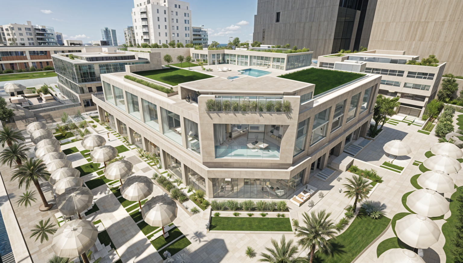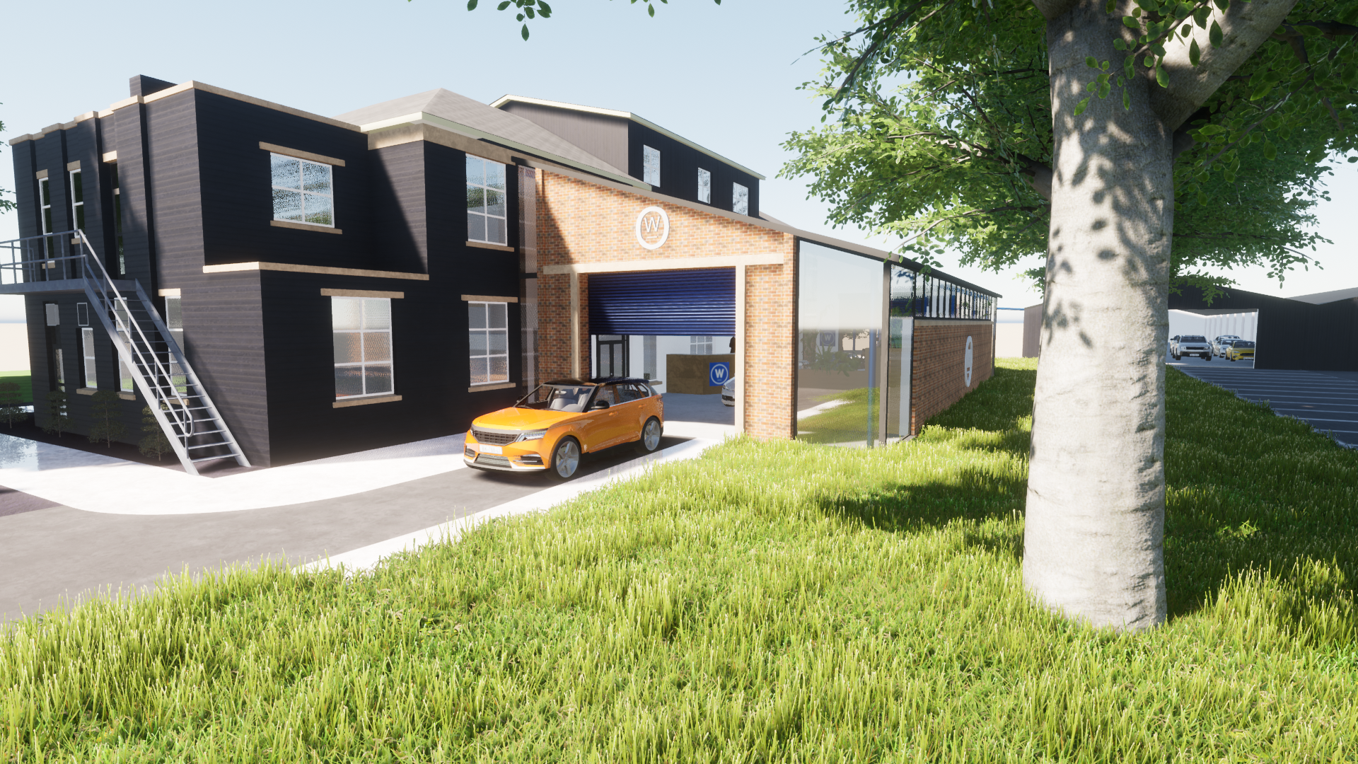 make this image into a photo realistic image a birck building attached to a dark building with glazing a big metal w sign over a roller shutter door