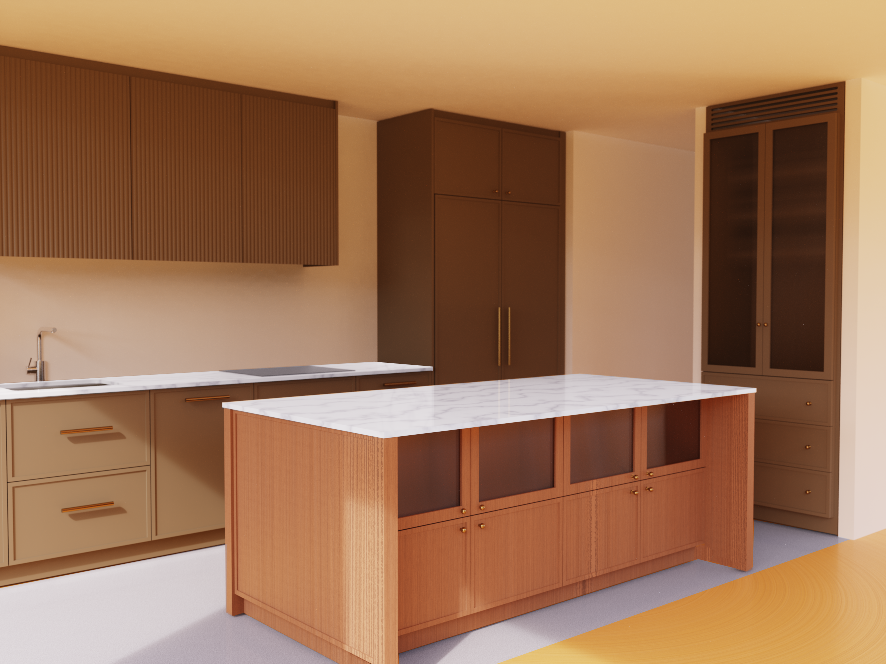 main cupboards are painted taupe island is walnut with reeded glass doors add marble splash back