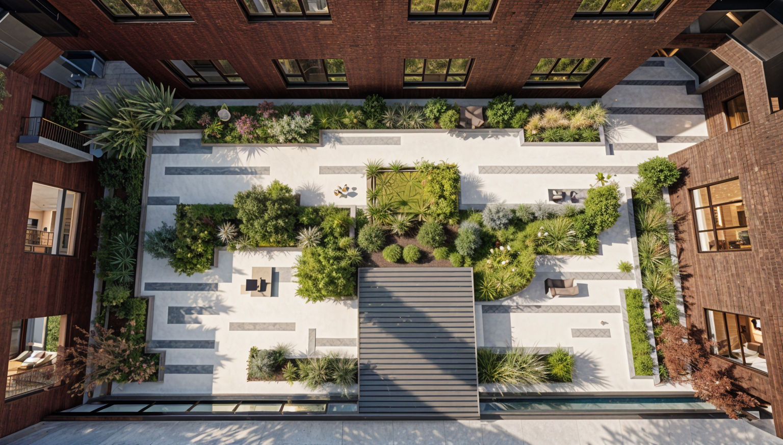 preserve view angle modern office building built with tilt up concrete design vertical forms entry is 2 story glass lobby with lighting inside show landscape design for office plaza and add outdoor collaboration seating and lounge seating add people walking standing and sitting wand working on laptops
