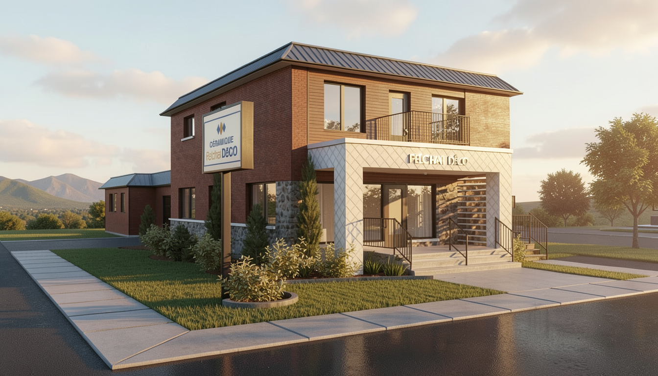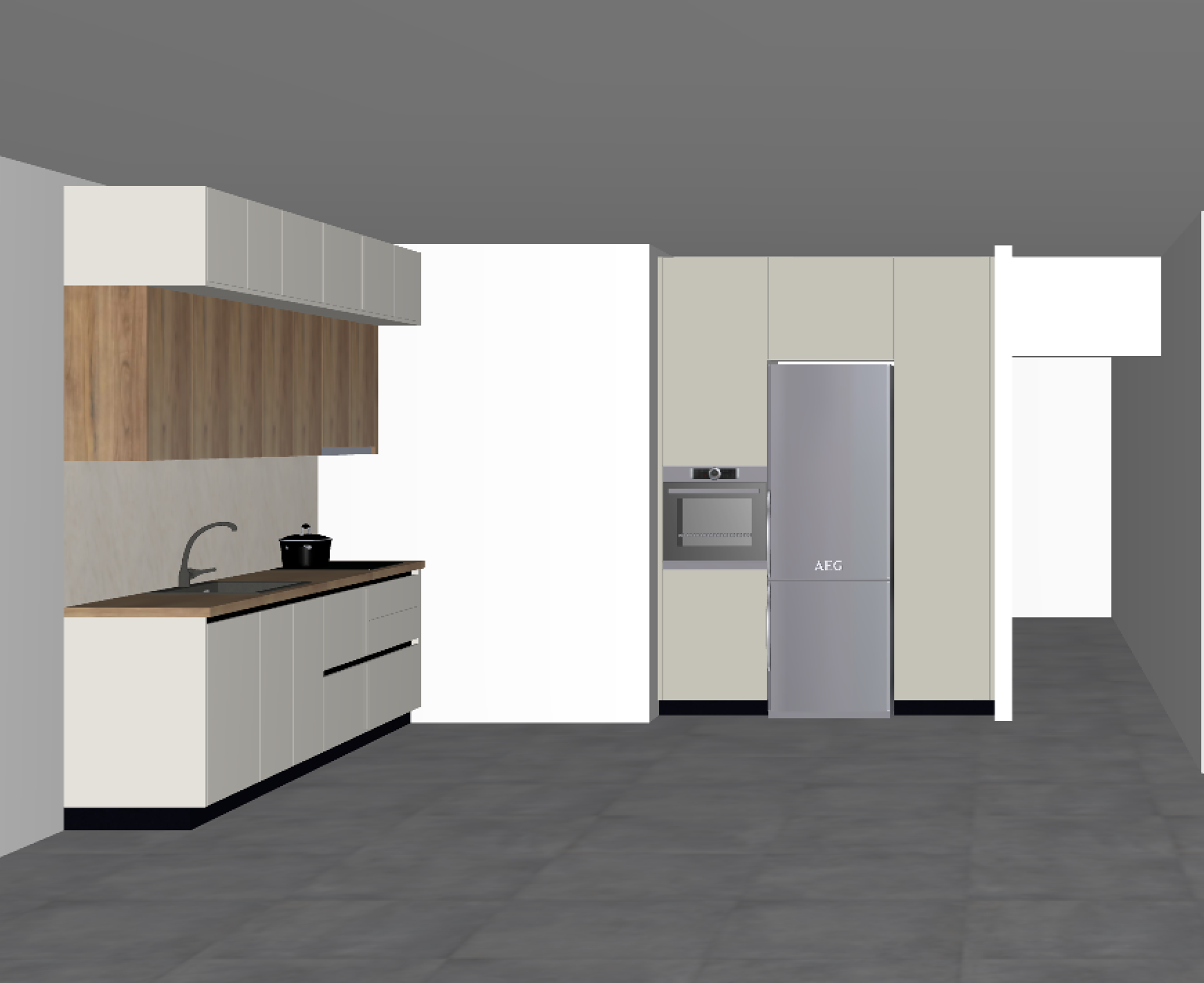 render a modern kitchen with a sleek minimalist design the cabinets are a soft beige color with wooden accents featuring a rich warm oak tone the countertop is a dark stone gray and the faucet and sink are a matte black finish the floor is a smooth polished gray tile and the refrigerator is a stainless steel silver create a calm inviting atmosphere with soft ambient lighting emphasize clean lines and open spaces for an elegant contemporary look
