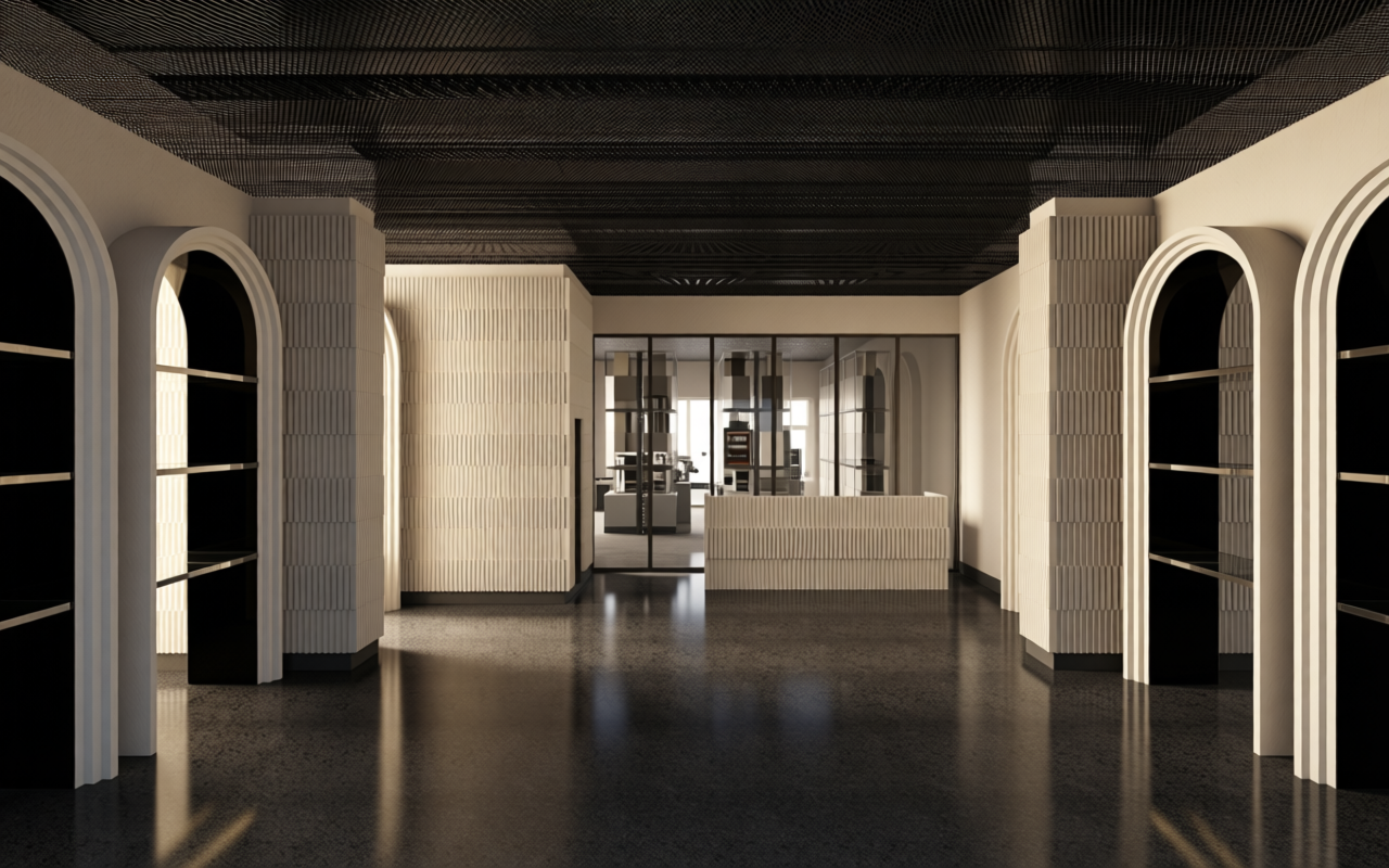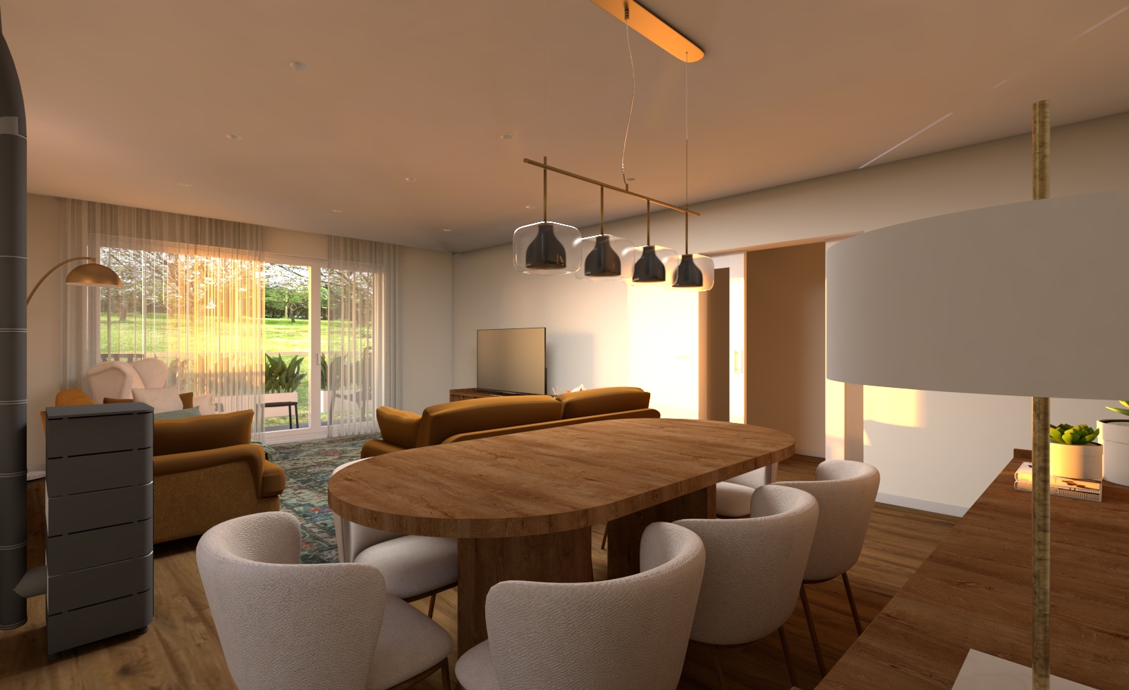 please make the most realistic and faithfull render from the picture the sofa has texture like la redoute noon bronze sofa the lamp abajour from the right corner chandelier is white fabric