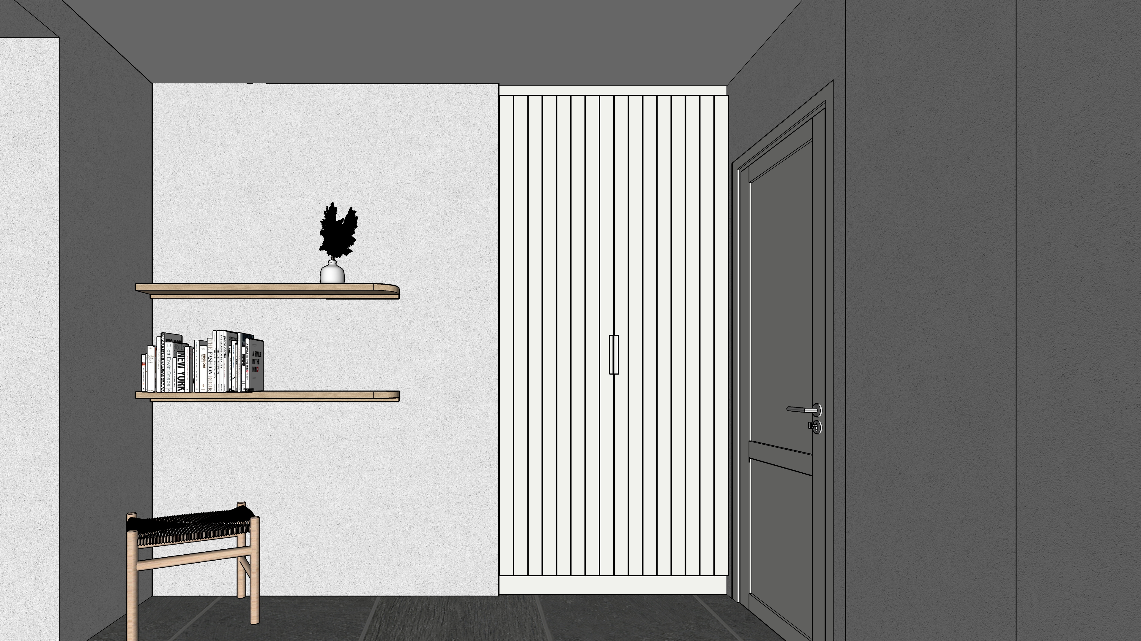 main prompt this is a cycladic house in kythnos the floor is natural grey pelion stone the closet is white the door is white the shelves are oak wood the walls are white there is natural light the stool is natural rattan color negative prompt do not change geometry do not add objects do no change colors or materials