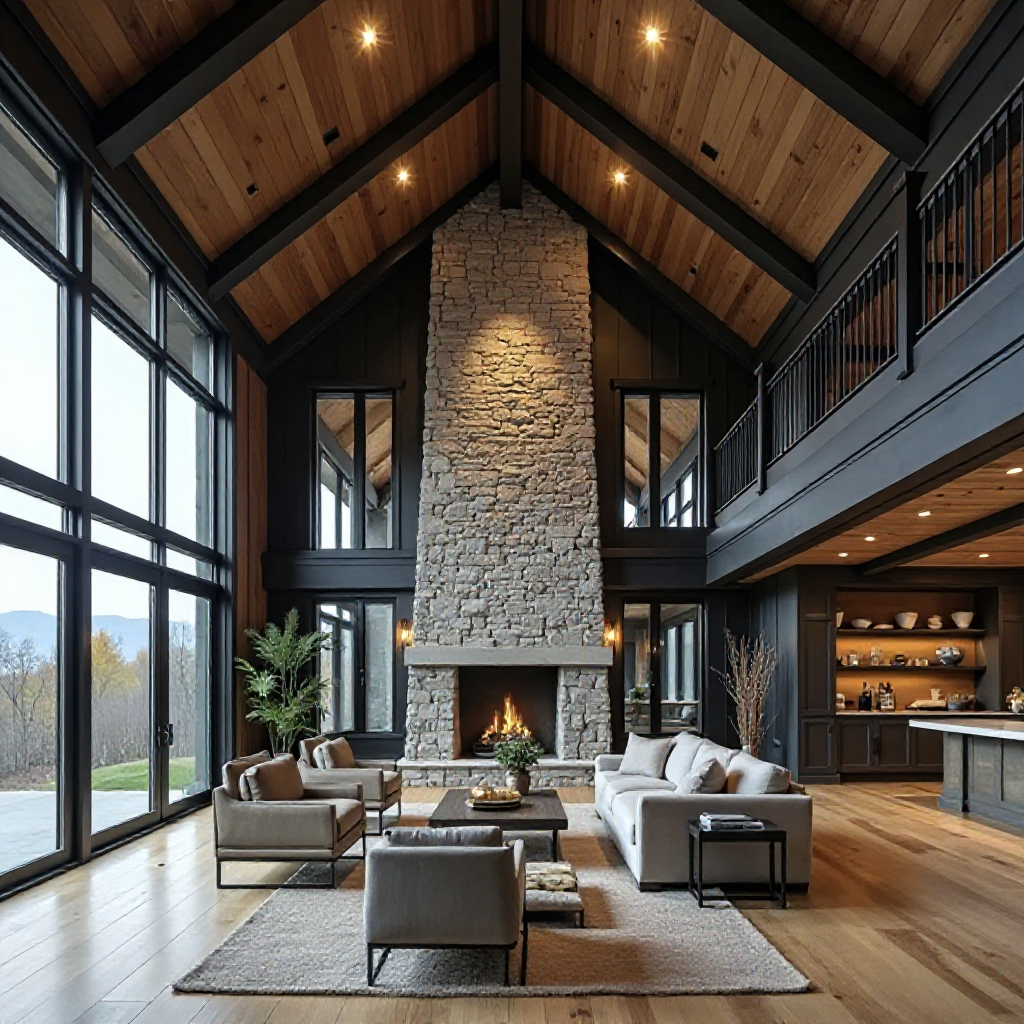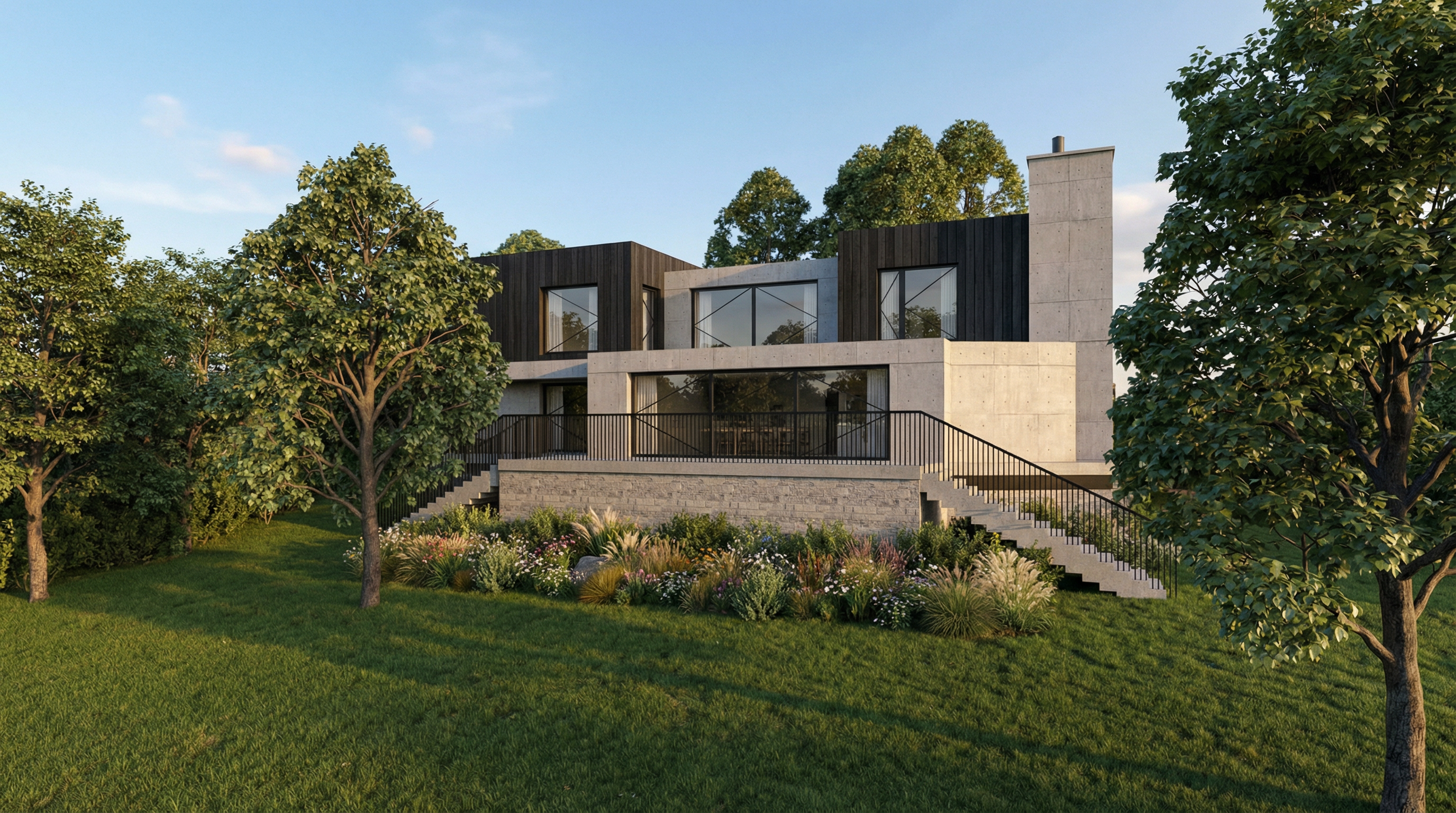 make me a realistic picture of a modern house in guyana with a realistic feel of the facade color and texture of smooth sand realistic wood whwre there is a wood on model and corten