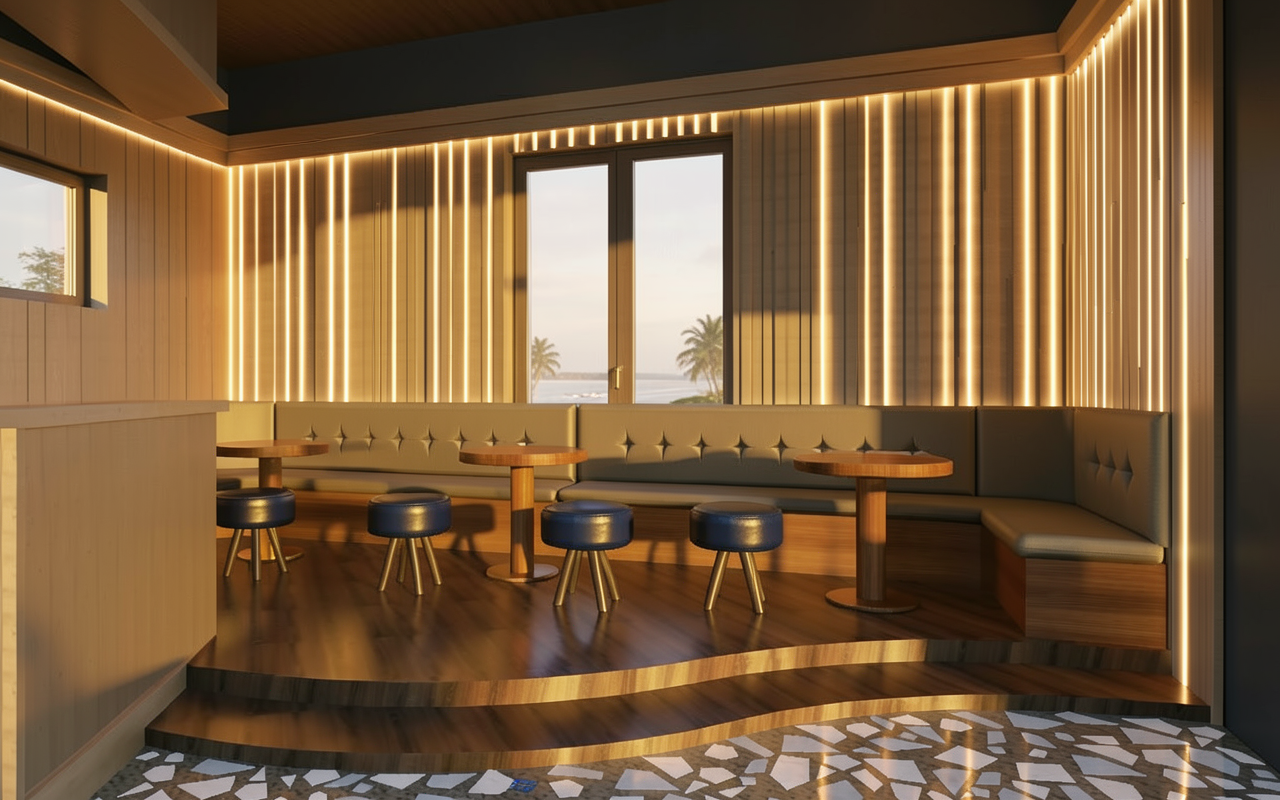 add some people sitting down inside the blue contained space cafe with modern high terrain interiors keep everything the same do not change anything