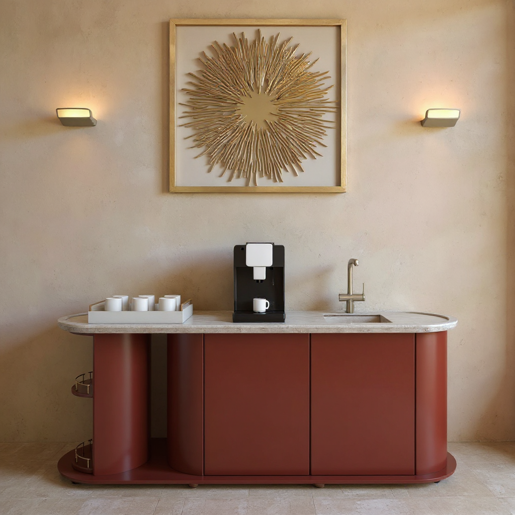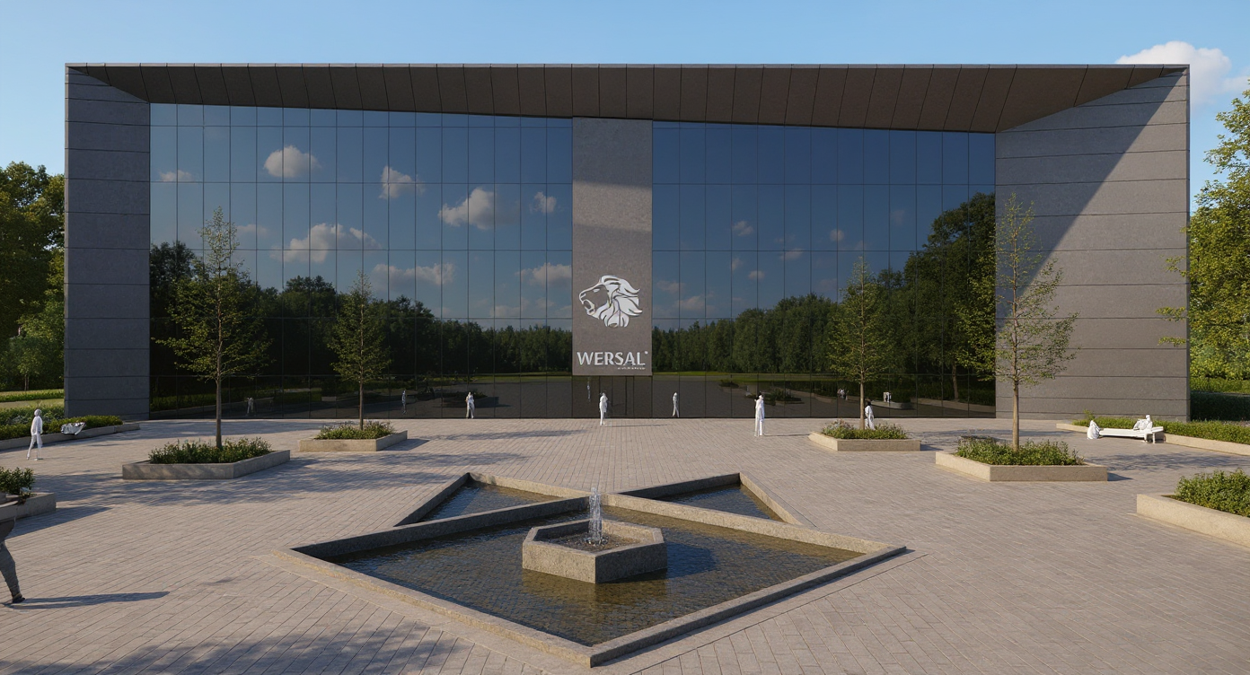 develop a modern square in front of the office building with small architecture geometric ponds and fountain and low decorative greenery add more people and benches add more trees in front of winter wiev more snow and sun