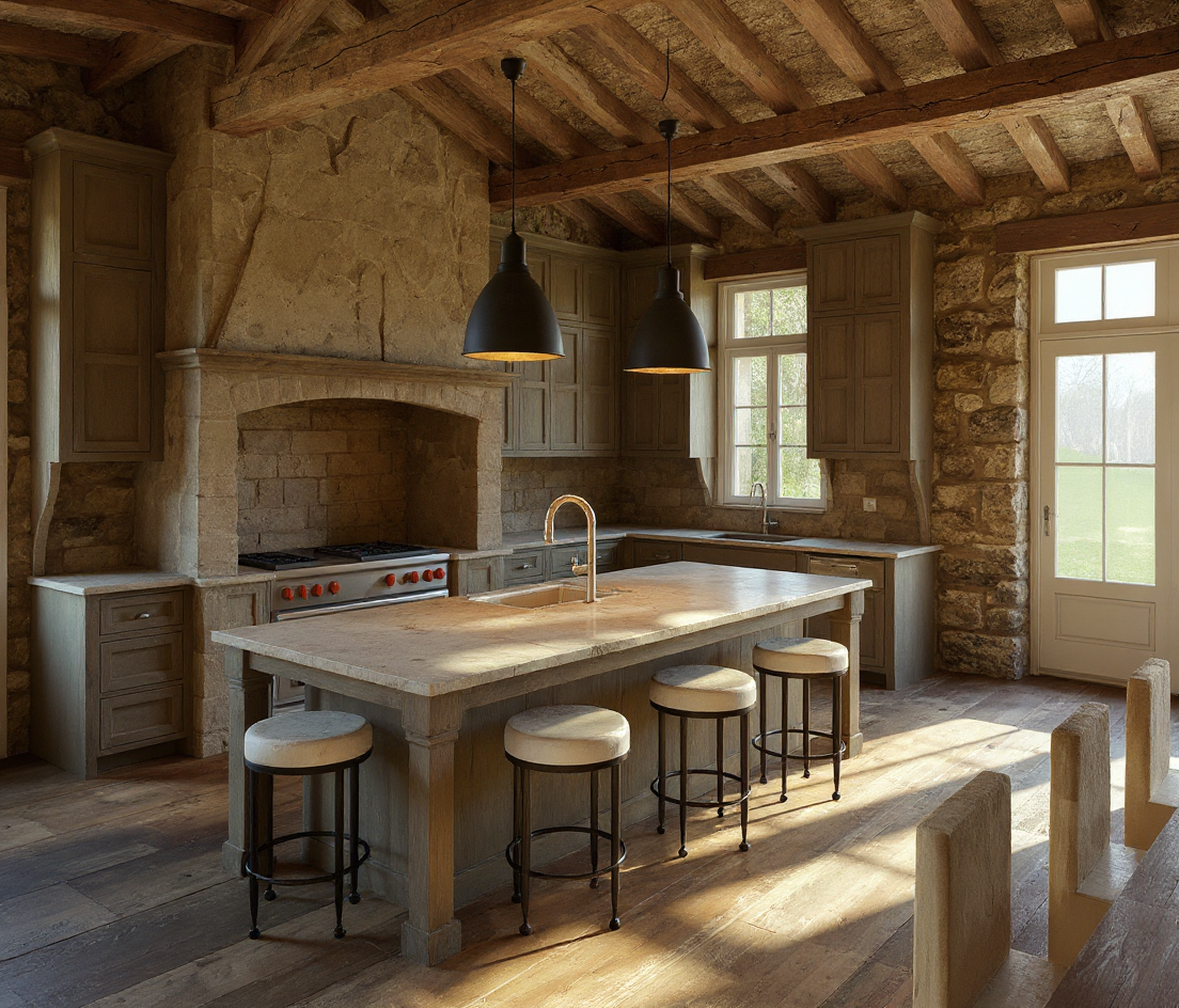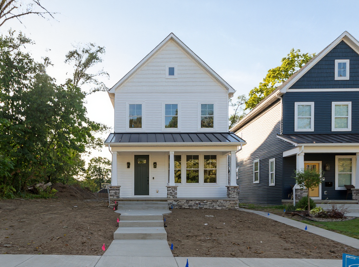 render a charming country style house with a warm inviting atmosphere the house should have dark grey black clapboard siding and a dark gray shingled roof the front doors and window frames feature a sleek black finish to match the siding the small porch area has natural rock and bluestone landscape the surrounding environment is lush and vibrant with a bright blue sky and soft diffused sunlight that enhances the cozy and timeless feel of the home incorporate green grass and a few flowering shrubs around the house to add a touch of nature architecture