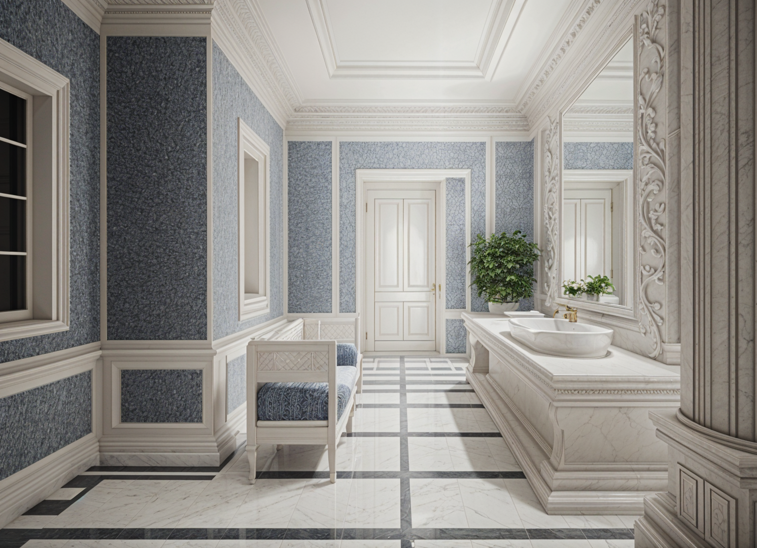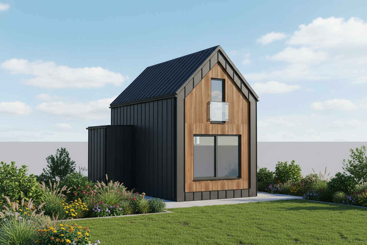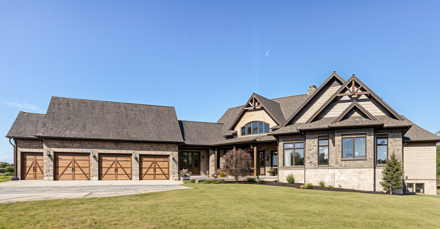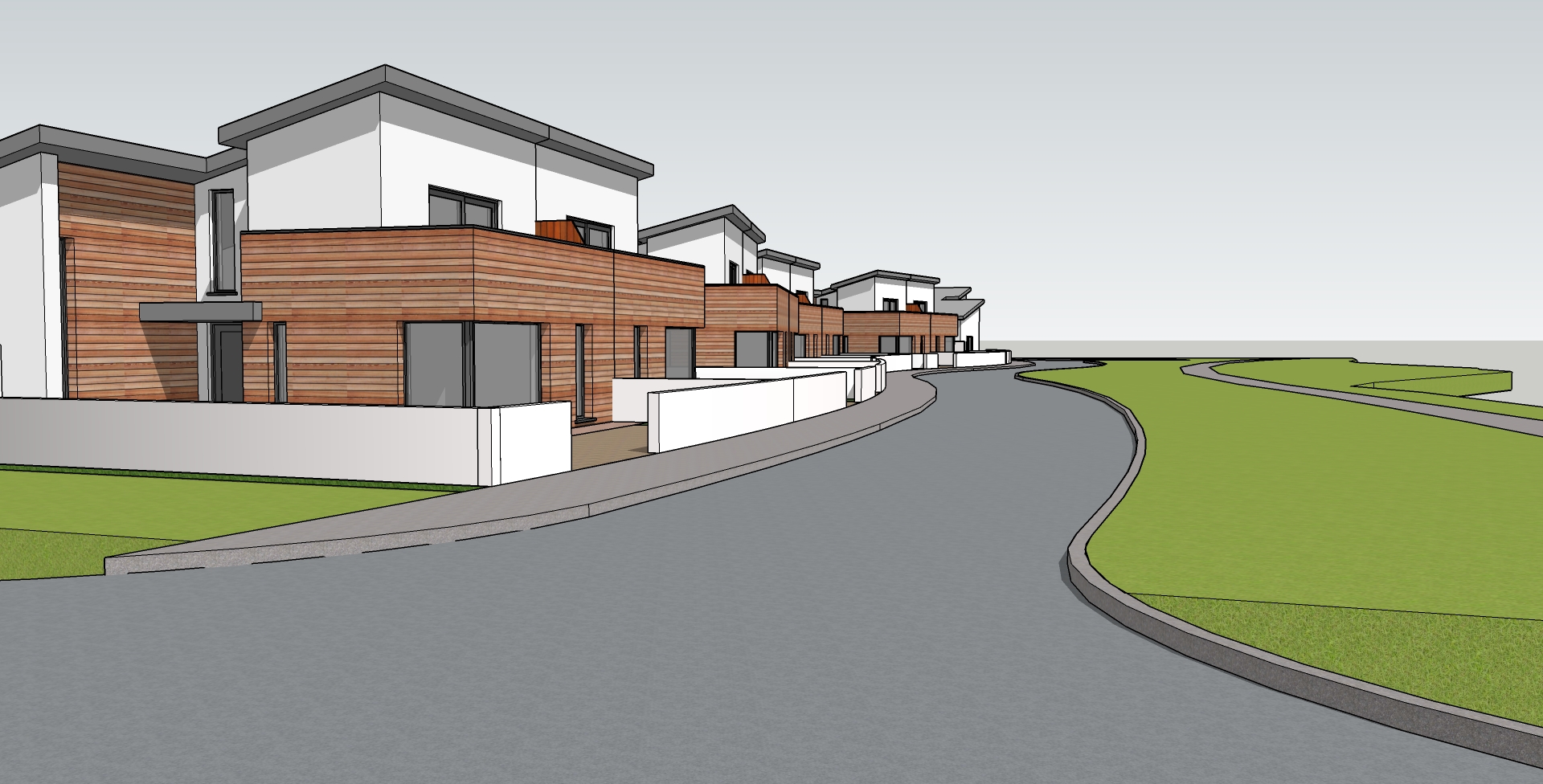modern residential street with contemporary houses lining a gentle curve featuring sleek white walls and warm wooden panels render the sky with a clear blue tone and illuminate the scene with soft golden sunlight casting long shadows the road is a smooth dark gray asphalt and the neatly trimmed lawns are a vibrant green aim for a crisp serene and inviting atmosphere capturing the elegance and tranquility of a modern suburban neighborhood