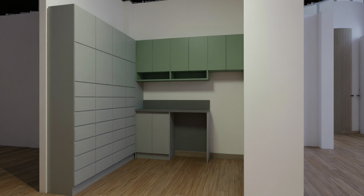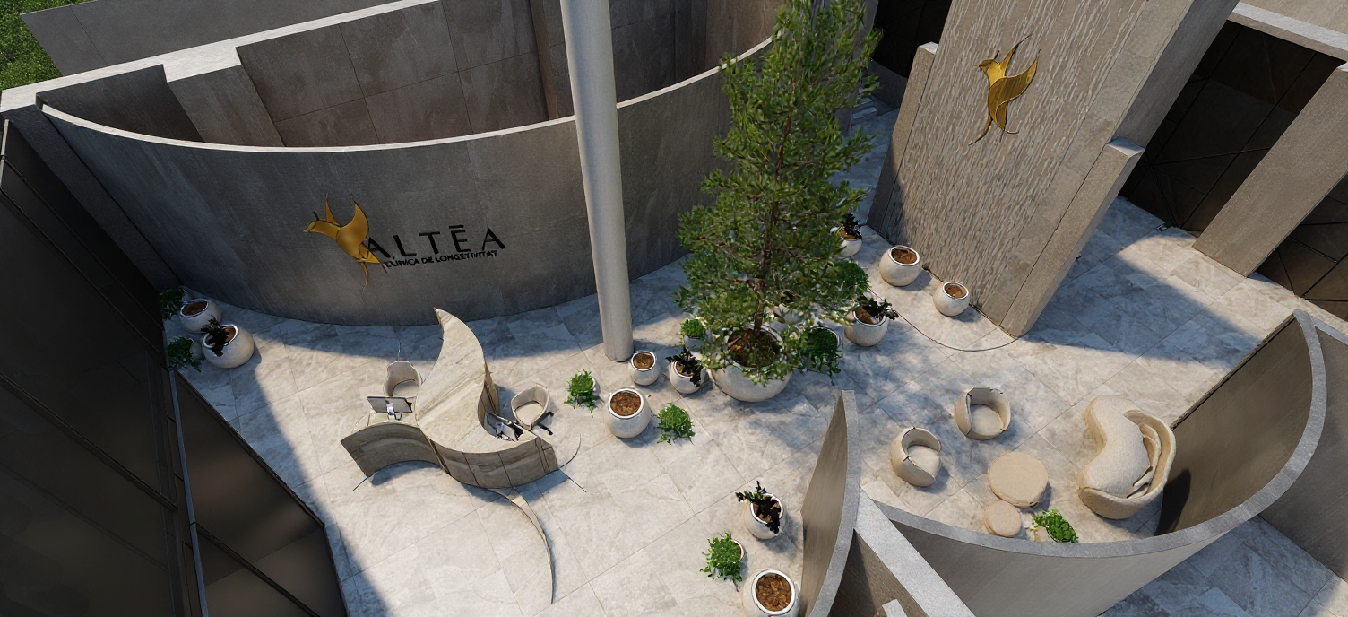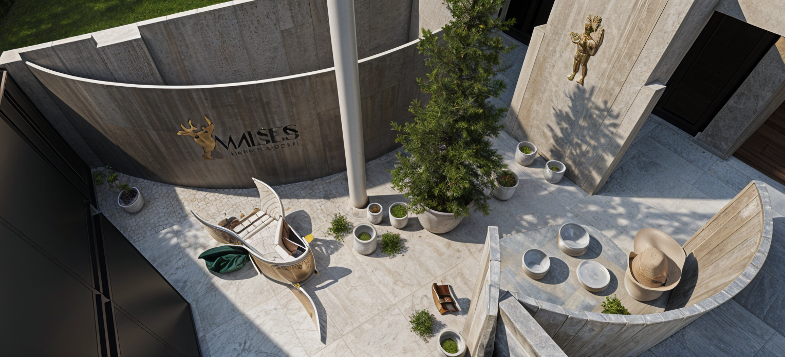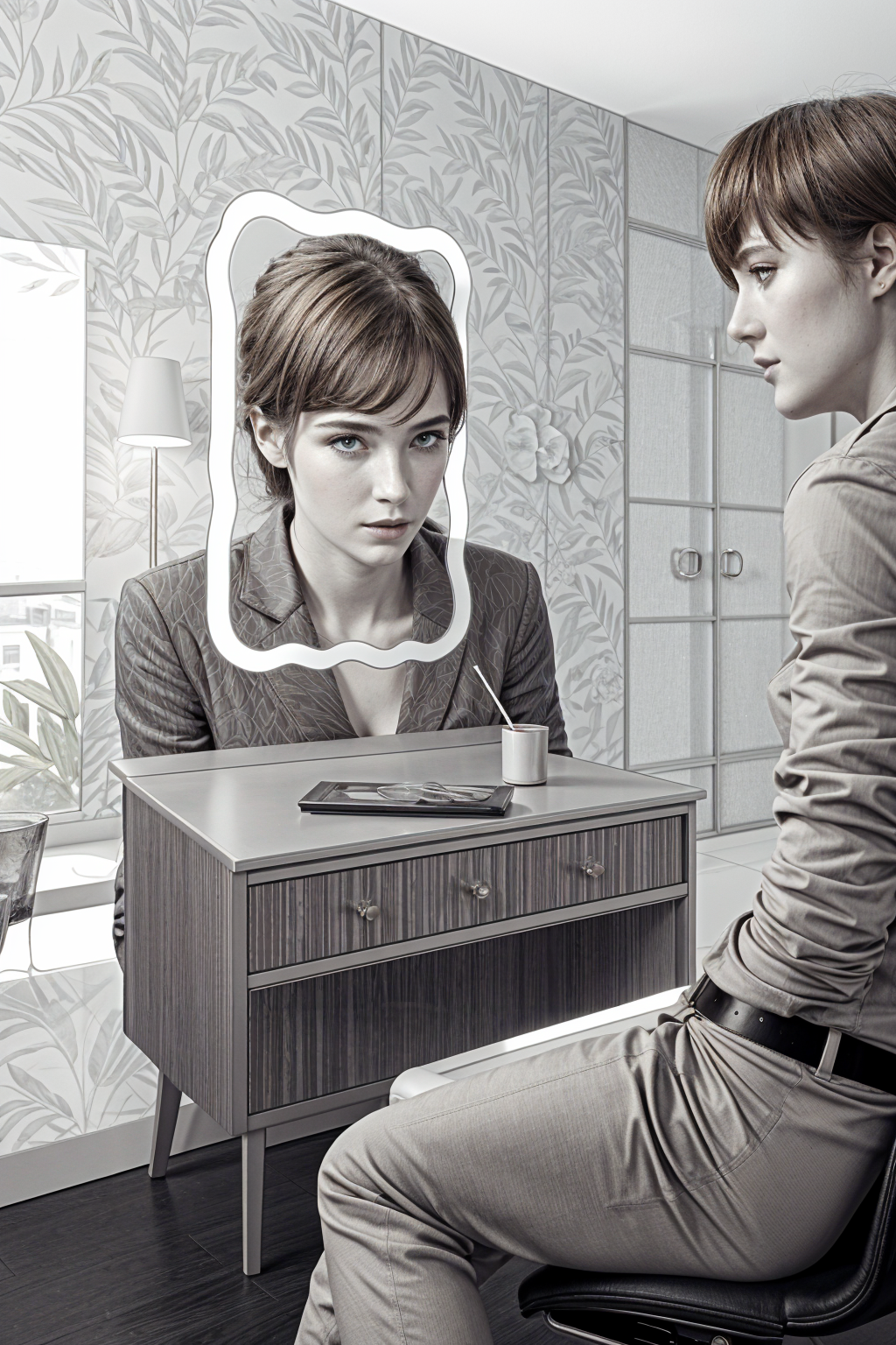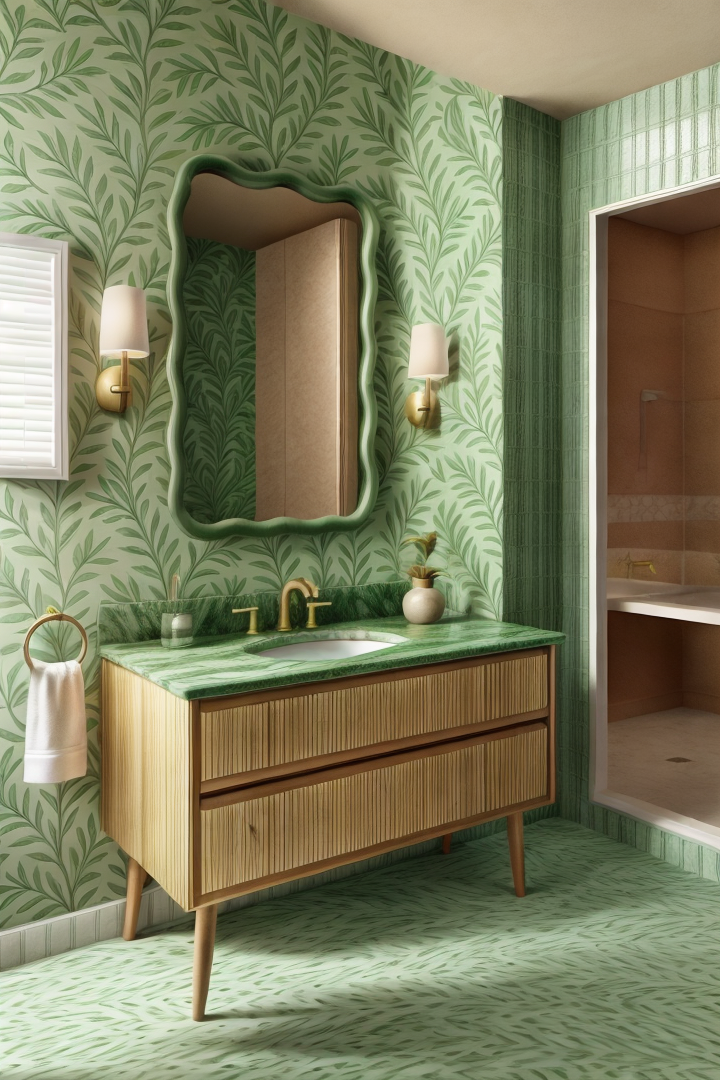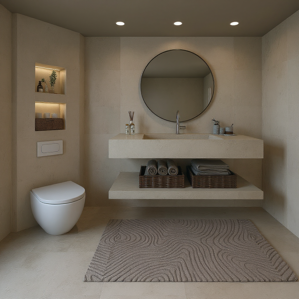render a modern bathroom interior with a sleek and minimalist design the walls feature textured light beige tiles creating a warm and inviting atmosphere the floating wooden vanity is crafted from rich walnut topped with a pristine white ceramic vessel sink the fittings including the faucet are stainless steel adding a contemporary touch the mirror above the sink has a frameless design extending horizontally the shower area is separated by a frameless glass partition with a rainfall showerhead overhead through the window soft natural light floods the space enhancing the serene and relaxing ambiance include subtle greenery visible through the window to add a touch of nature