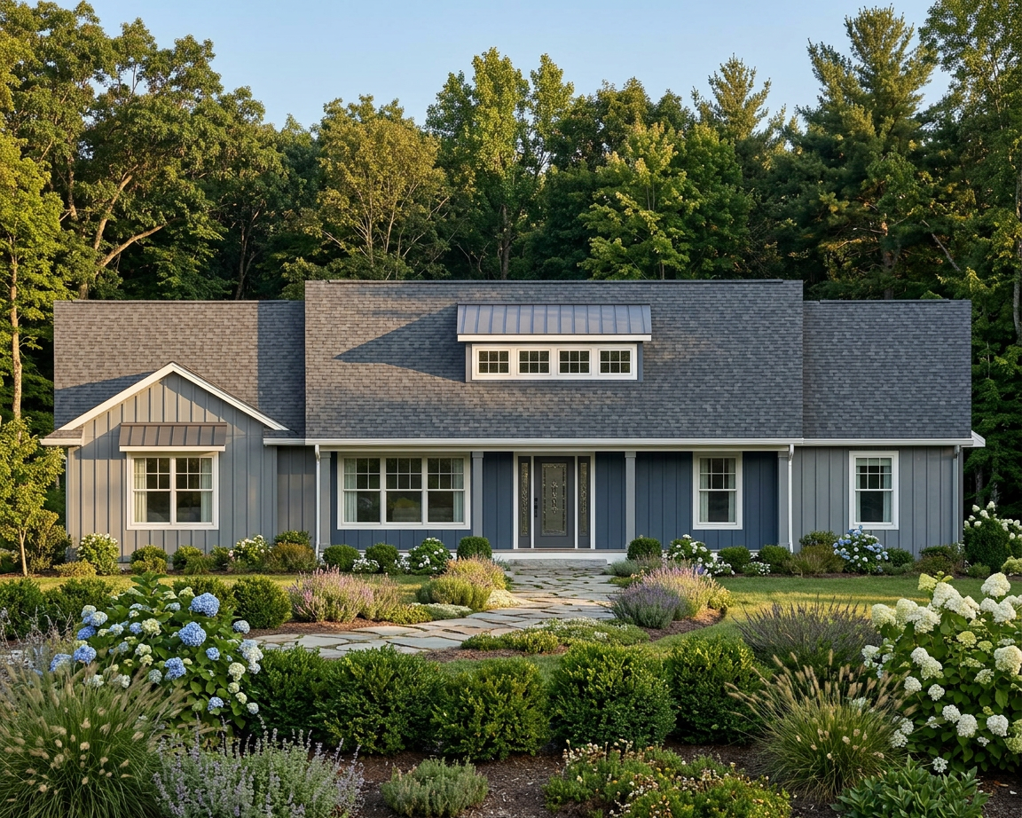 board and batten siding dark standing seam roofing add in railing at porches to match aesthetic wood corner trims add in minimal landscaping dark window trims black railing spindles and oak rails