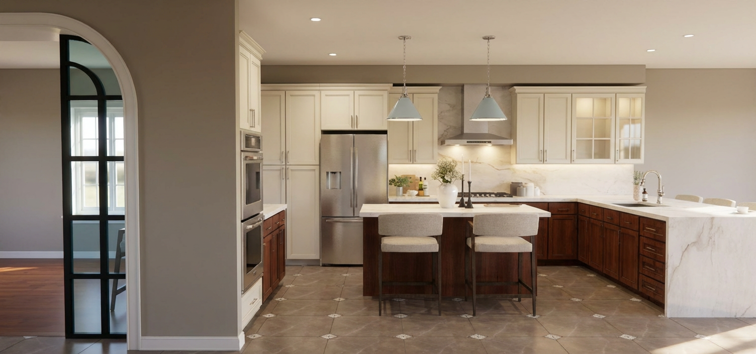 create a photorealistic rendering of the uploaded sketchup interior model preserve the exact layout geometry and proportions of all elements cabinets island windows walls and doors do not change materials colors finishes or textures use soft natural daylight coming through the windows supplemented by subtle artificial lighting under cabinets and above materials should appear tactile and realistic cherry wood grain cream painted cabinets quartz countertops baby blue pendants with chrome hardware taupe eggshell walls polished nickel cabinet hardware and plumbing fixtures and fabric textures include realistic reflections and shadows space should feel warm calm minimal and uncluttered camera angle at human eye level composed like professional interior photography high quality architectural visualization no redesign of geometry or materials add soft exterior scene through windows remove blue hue from glass replace with clear glass