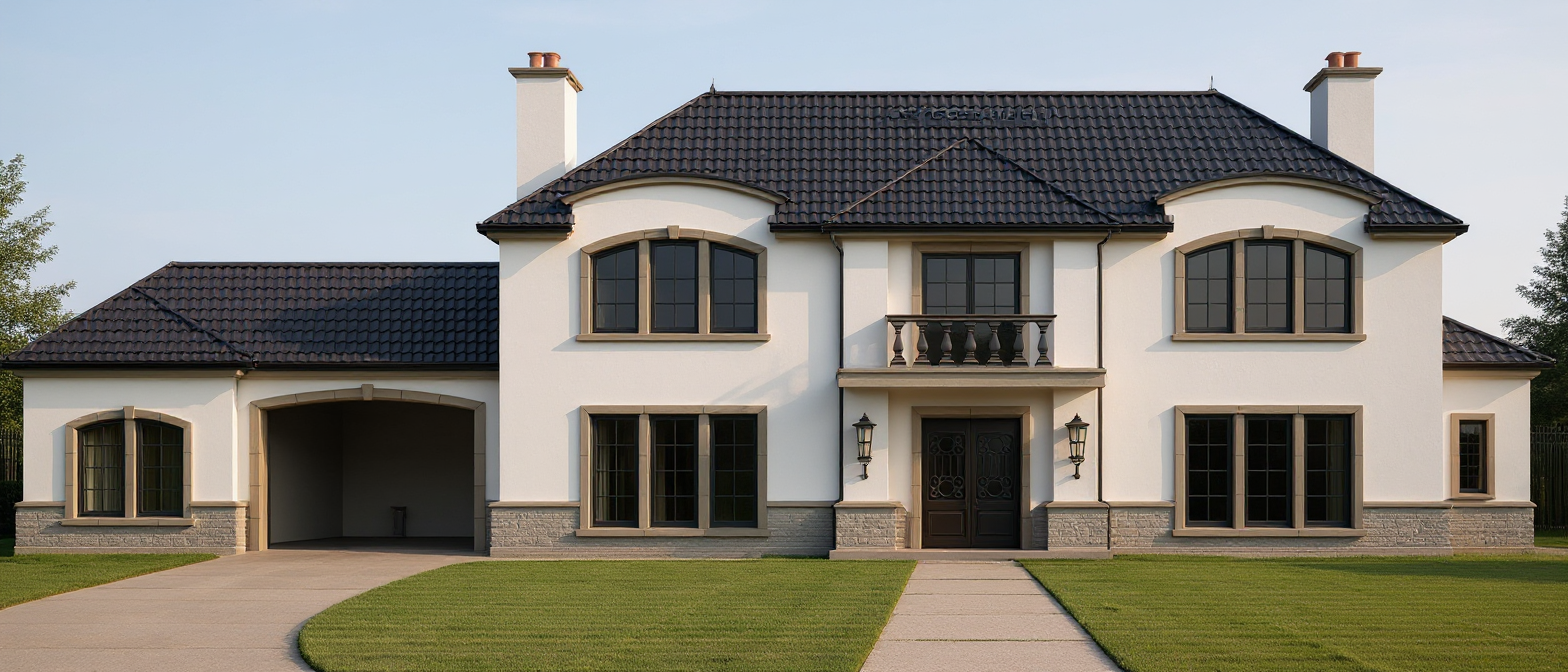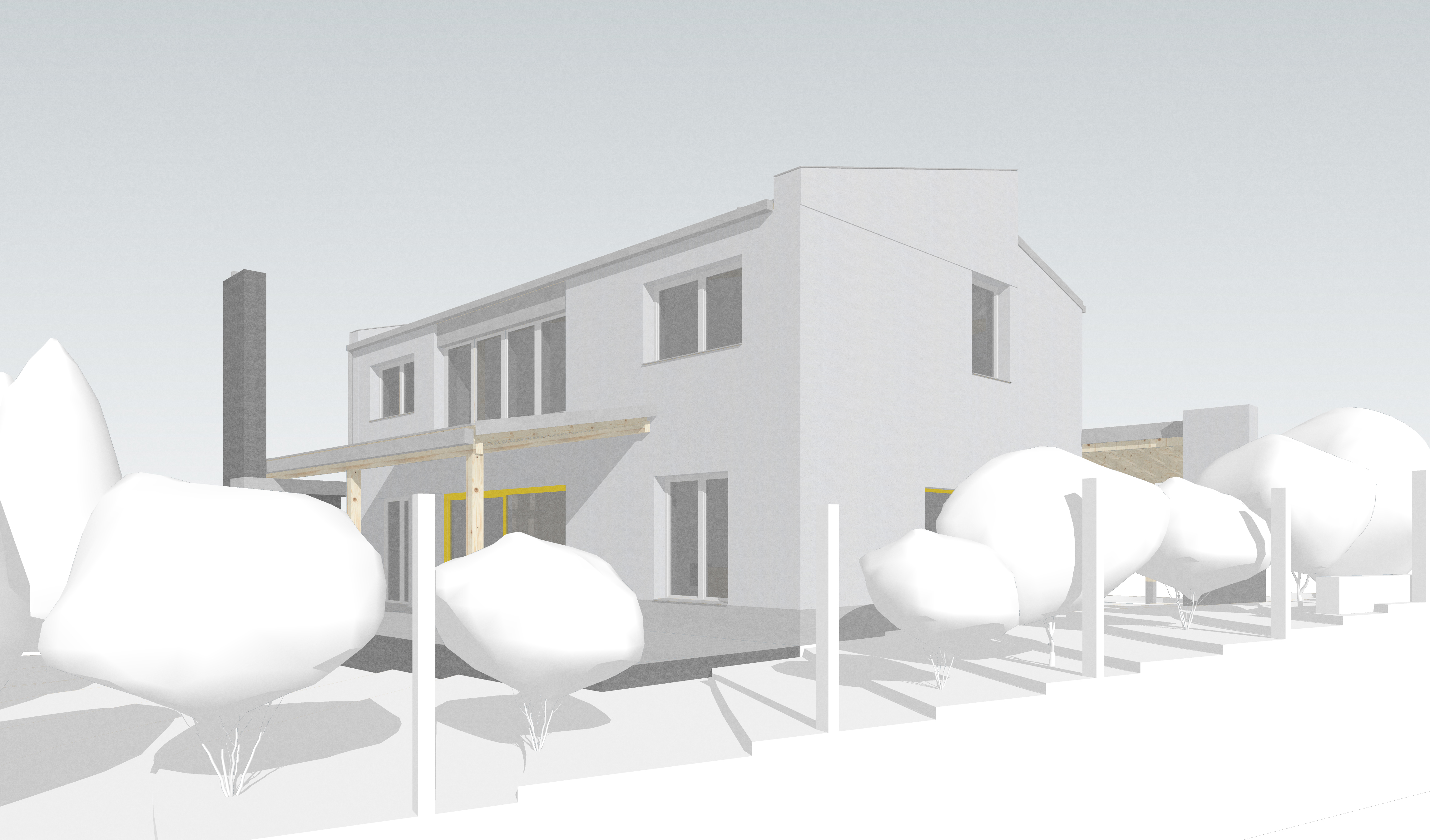 winter with snow neutral lighting daylight light white rough stucco plaster light color spruce timber light concrete block chimney bushes behind a wire metal fence in the front