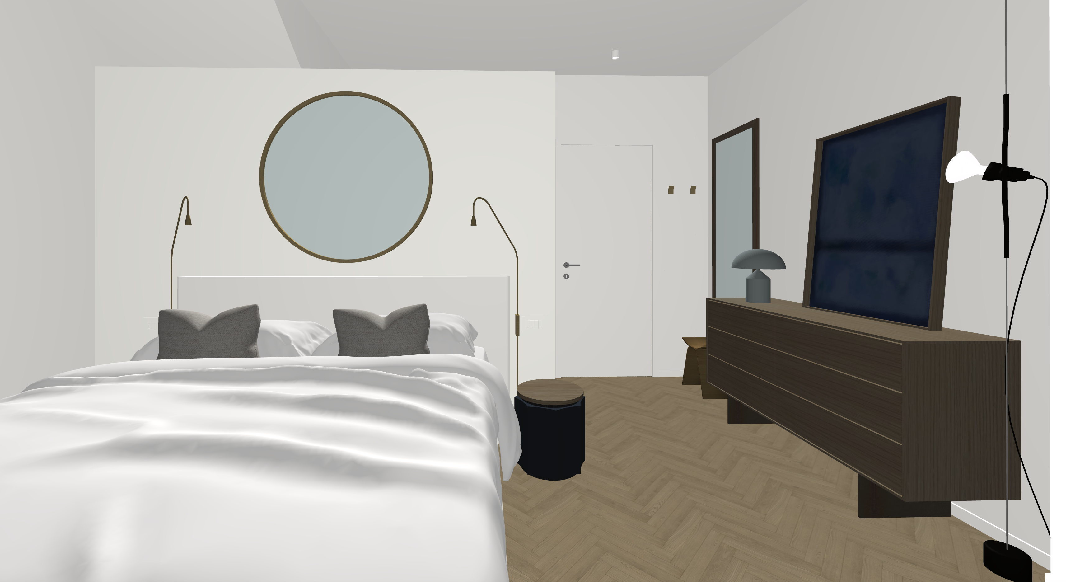 camera con letto matrimoniale in tessuto di cotone bianco caldo la testata del letto leggermente smussata ai lati sopra al letto c uno specchio tondo con cornice sottile in ottone che riflette la portafinestra della parete di fronte con tende leggere di fianco al letto ci sono due lampade in ottone accese non ci sono strip led che illuminano la stanza sopra all ingresso della stanza c un faretto ad incasso acceso con luce calda a destra dell ingresso c uno specchio sopra alla cassettiera c una lampada accesa e a fianco del quadro la lampada parentesi di flos accesa i due cuscini decorativi del letto sono di colore beige chiaro fai entrare un p di luce naturale dalla portafinestra di spalle la porta finestra non sulla parete di sinistra