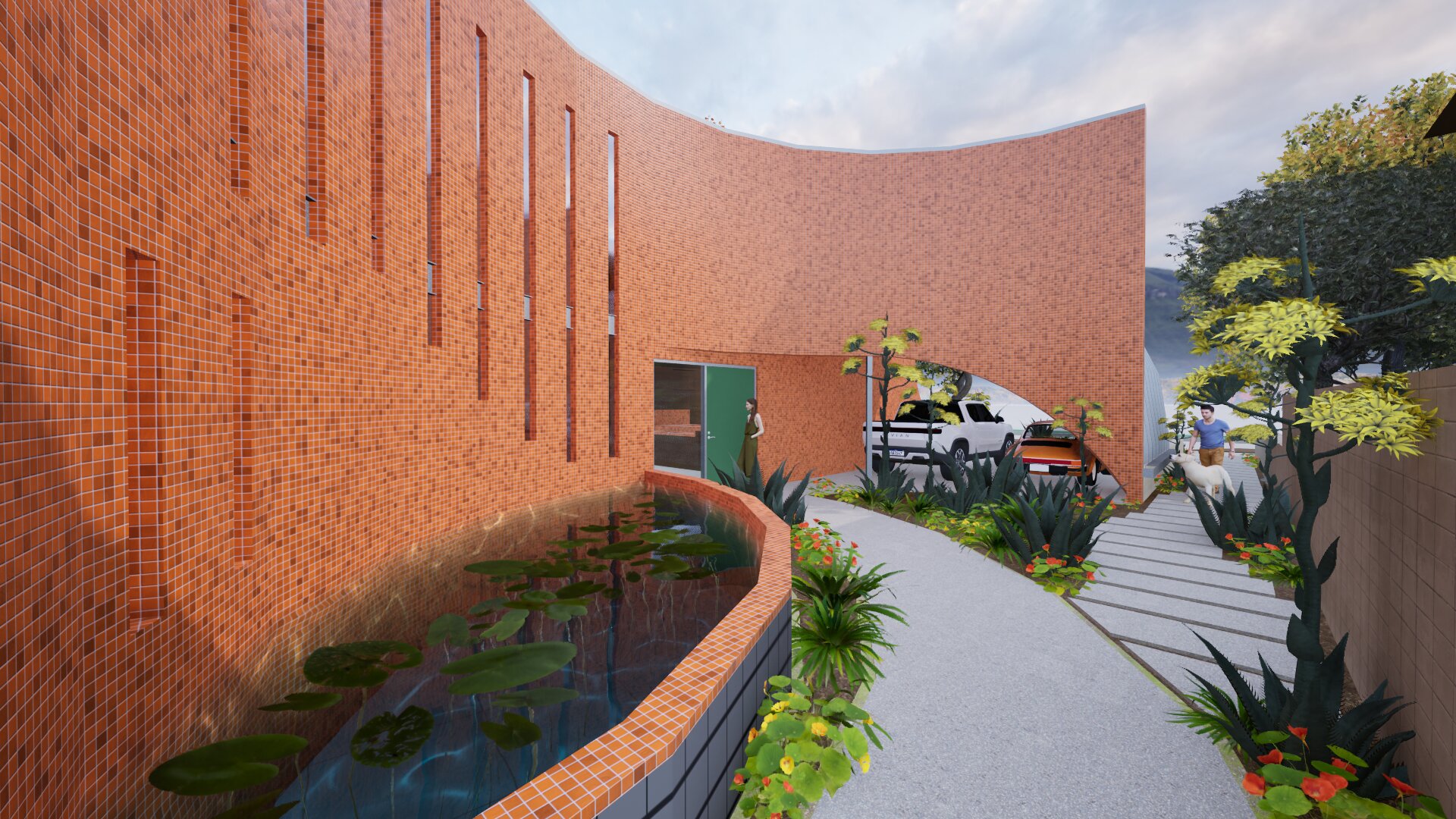 replace the orange tile with a graffiti style tile mosaic mural add blossoming lotus and koi fish to the water feature add people to the scene add a few birds in the sky and a humming bird in the foreground with motion blur on its wings