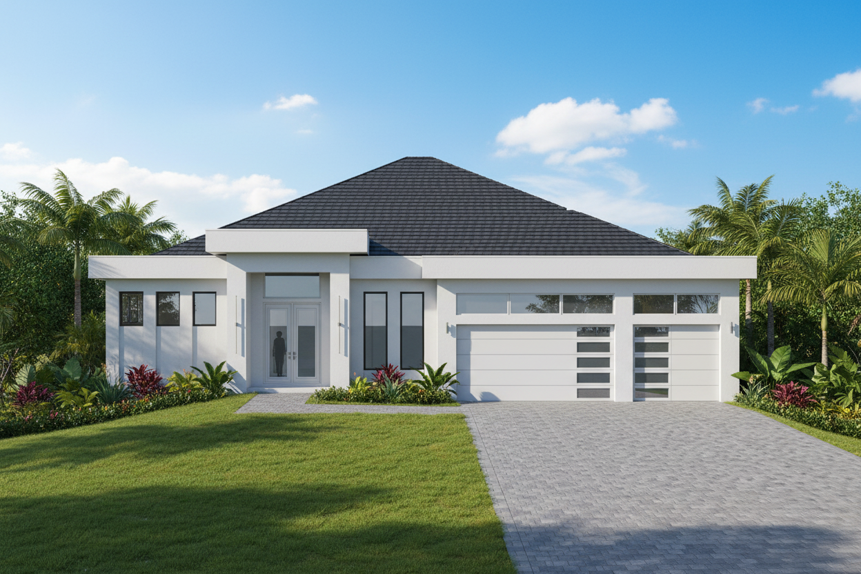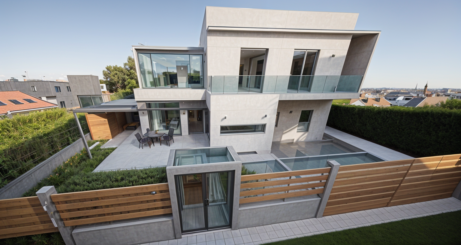 contemporary exterior shot gray asphalt shingles white board and batten siding gray horizontal siding gray metal roof and brown timber brackets in woods architecture